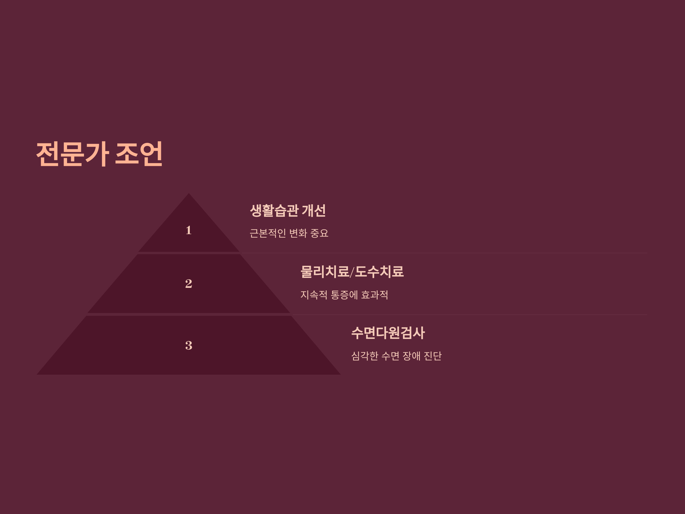 전문가들은 허리 통증이 지속되면 물리치료나 도수치료를 고려하라고 조언합니다. 약물 치료는 일시적인 완화에 그칠 수 있으므로 생활습관을 근본적으로 바꾸는 것이 중요합니다. 또한, 수면 장애가 심각할 경우 수면다원검사를 통해 상태를 정확히 파악하는 것도 필요합니다.