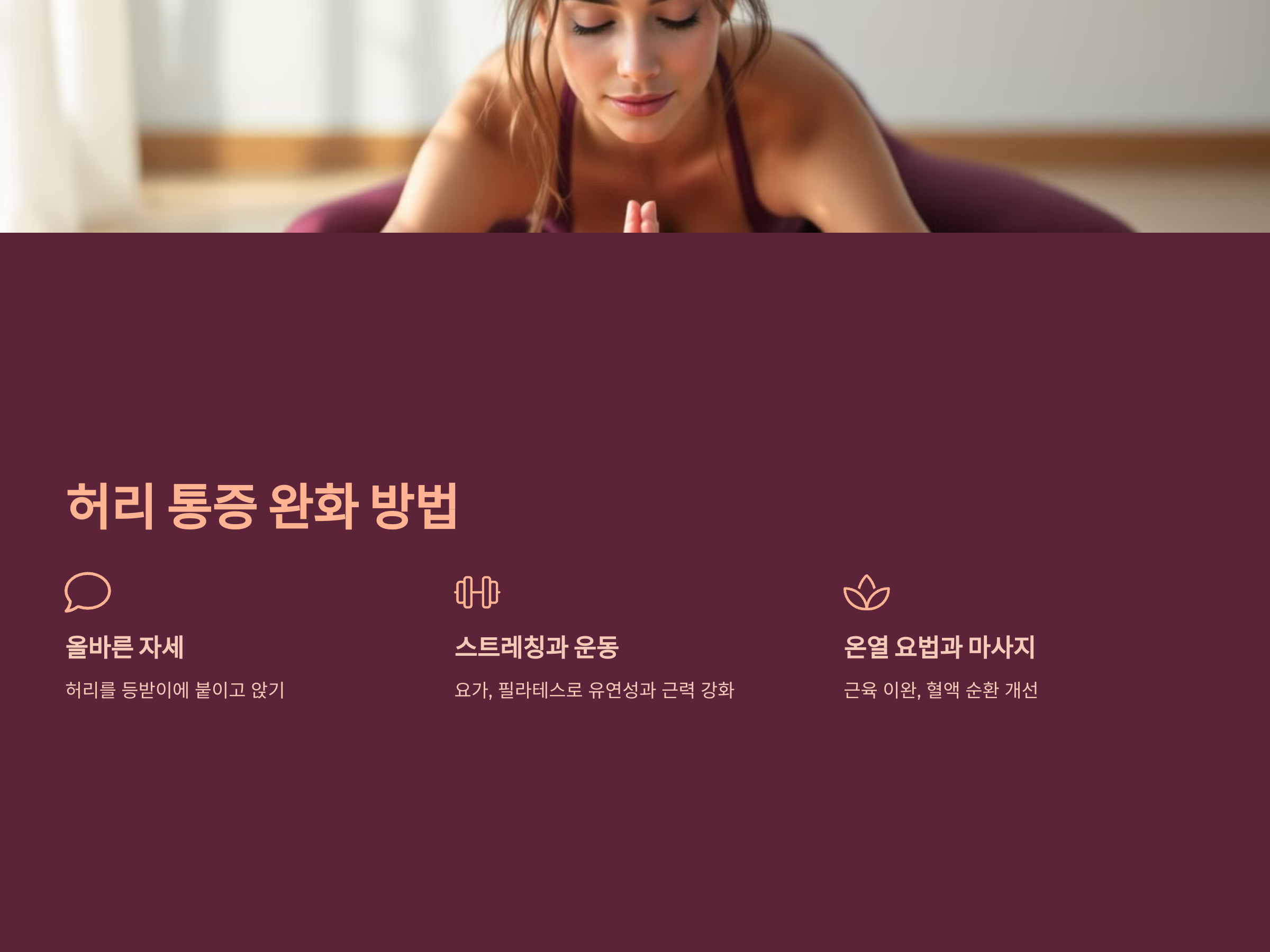 허리 스트레칭과 근육 강화 운동은 통증 완화에 효과적입니다. 특히 요가나 필라테스는 척추의 유연성을 높이고 근력을 강화해 허리 통증을 줄이는 데 도움이 됩니다. 아침이나 저녁 시간에 간단한 스트레칭을 실천하세요.