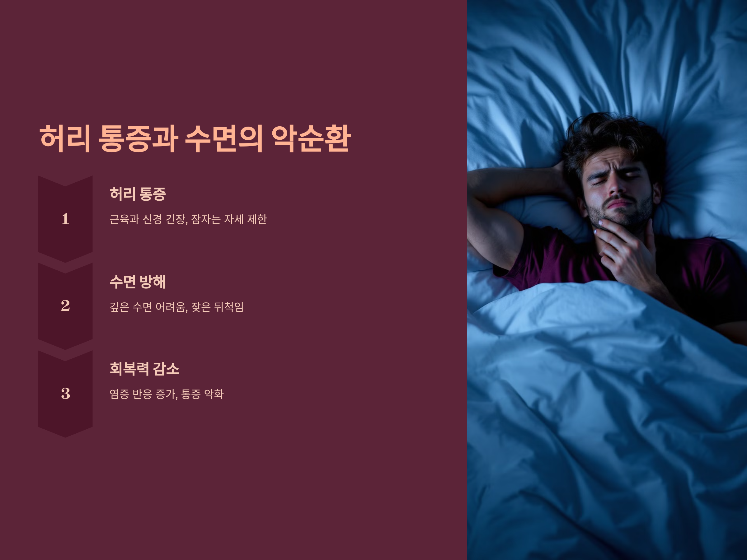 허리 통증은 근육과 신경을 긴장시켜 숙면을 방해합니다. 통증이 심할수록 잠자는 자세가 제한되며, 이는 불편한 수면 환경을 만들고 결국 깊은 수면을 방해합니다. 통증으로 인해 뒤척임이 많아지면서 수면 단계가 지속적으로 깨지는 현상이 나타납니다.