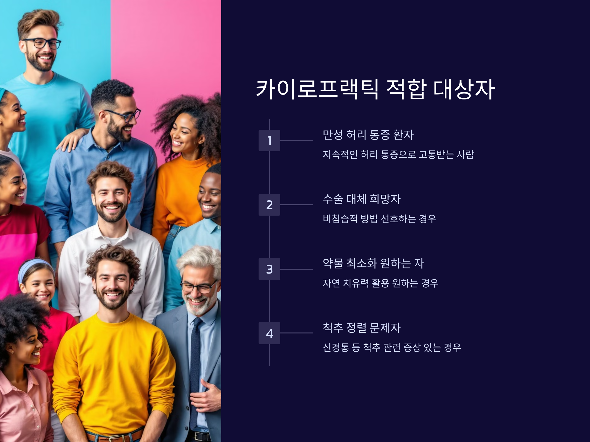 허리 통증은 삶의 질을 크게 떨어뜨리는 문제로, 카이로프랙틱 요법은 이를 완화하는 데 효과적인 치료법으로 알려져 있습니다. 그러나 개개인의 상태에 따라 적합성이 다를 수 있으므로 전문가와 충분히 상담하고 신중히 선택해야 합니다.