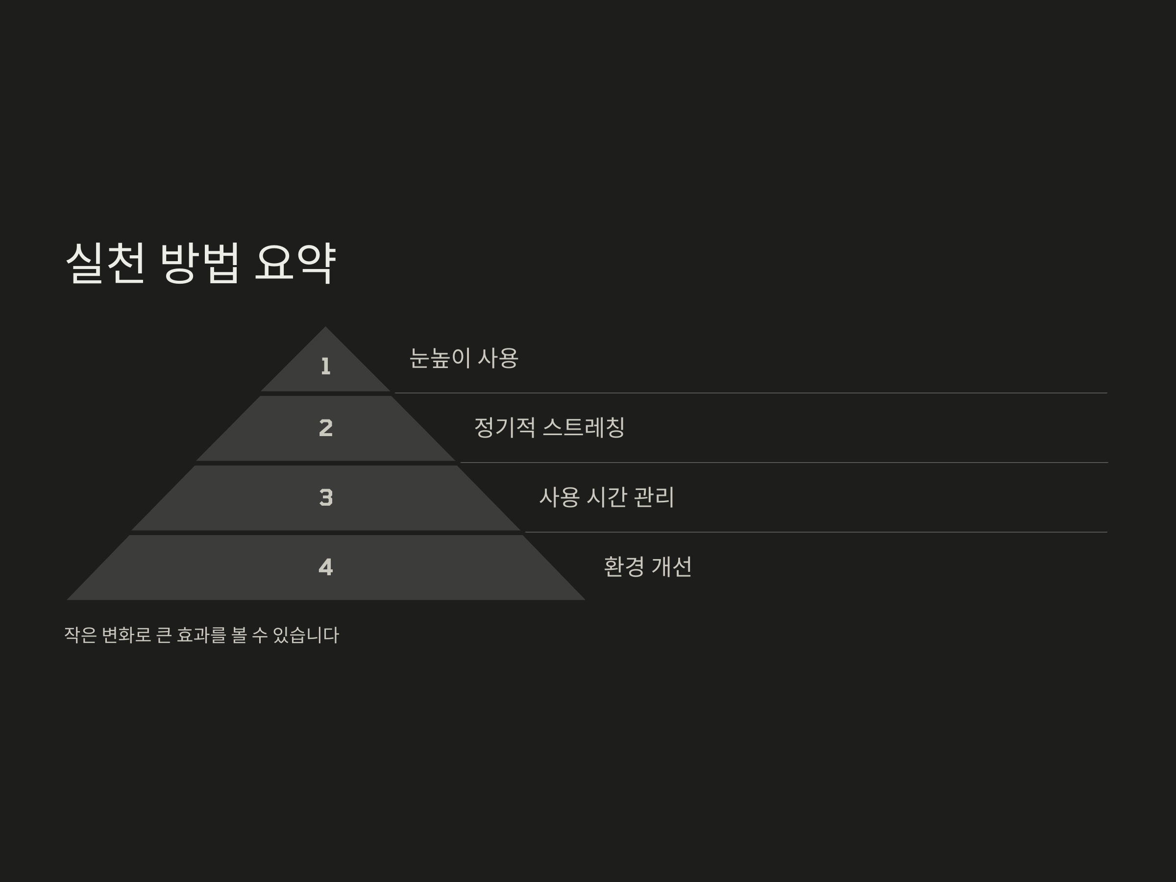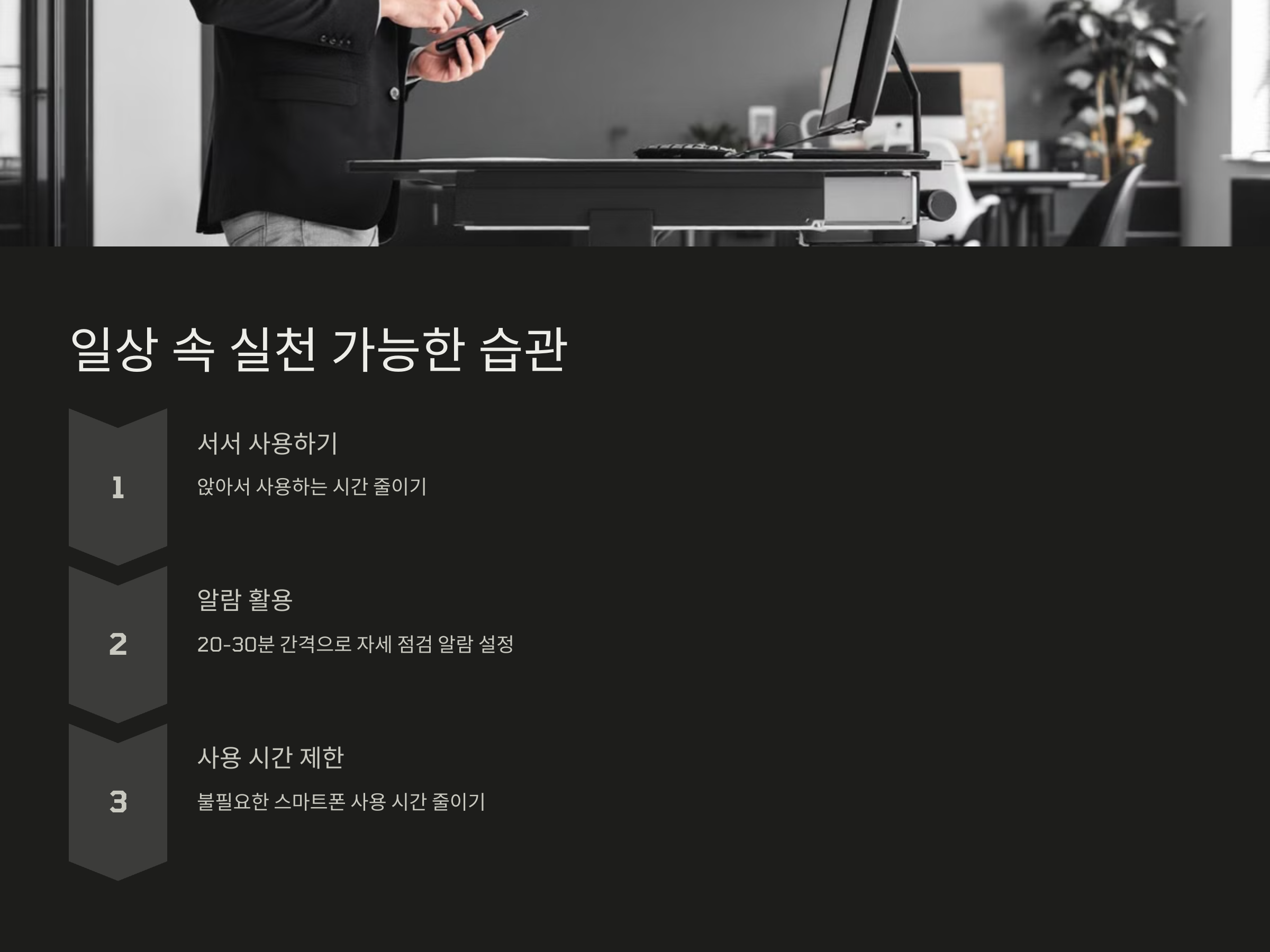 장시간 사용을 피하고 30분마다 자세를 확인하여 바르게 교정하세요. 필요하면 자리에서 일어나 간단한 스트레칭을 해주는 것이 좋습니다.