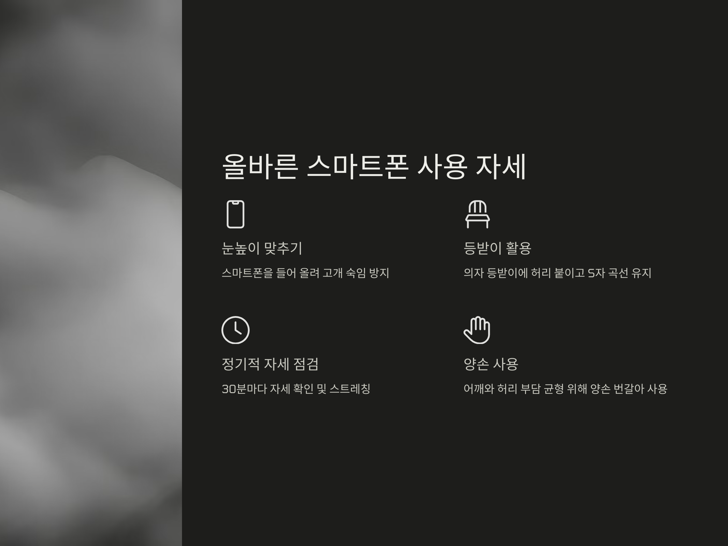 한 손으로만 스마트폰을 오래 사용하면 어깨와 허리에 비대칭적인 부담이 생깁니다. 양손을 번갈아 사용하세요.