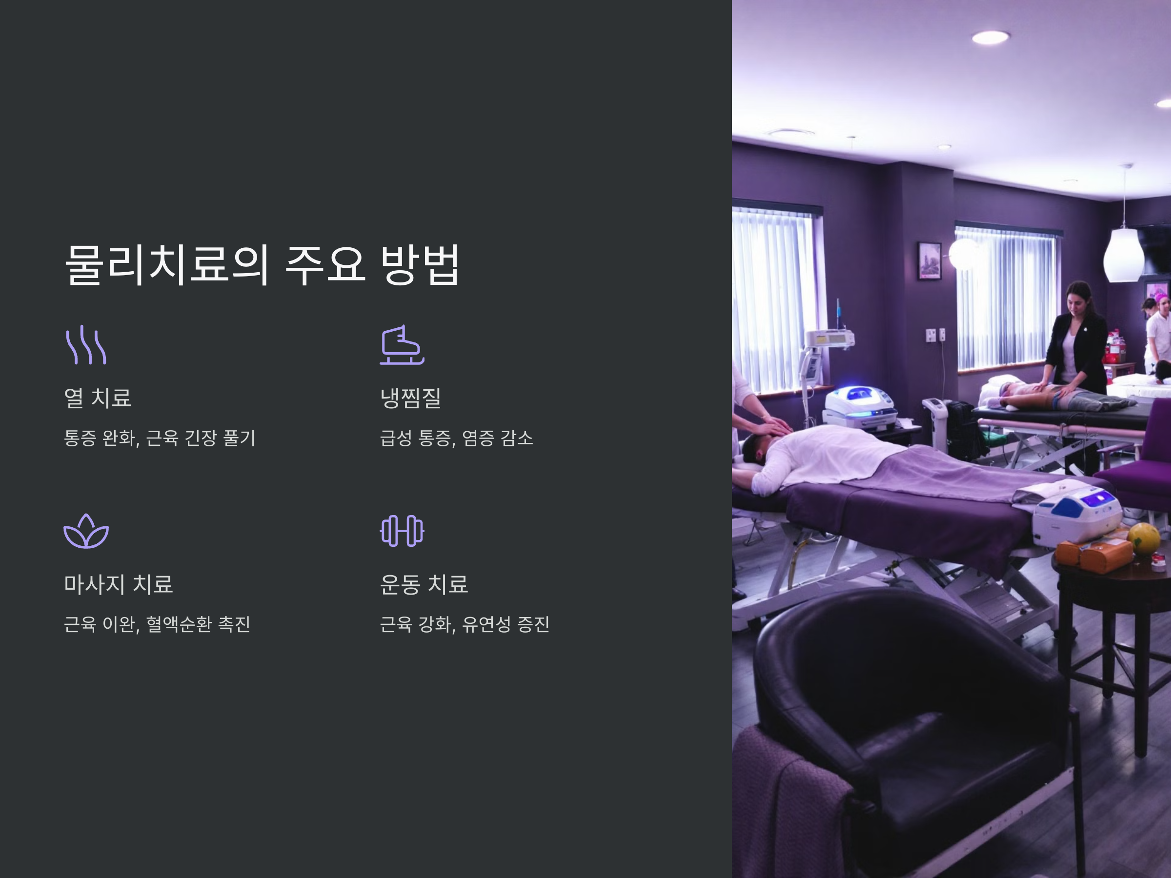 물리치료는 약물치료나 수술 없이 물리적 방법을 통해 통증을 완화하고, 체내 기능을 회복시키는 방법입니다. 이를 통해 혈액순환을 촉진하고, 근육의 긴장을 풀어주며, 관절의 움직임을 개선하는 등의 효과를 기대할 수 있습니다. 또한, 물리치료는 꾸준히 받을 경우 허리 통증의 재발을 방지하는 데도 큰 도움이 됩니다.