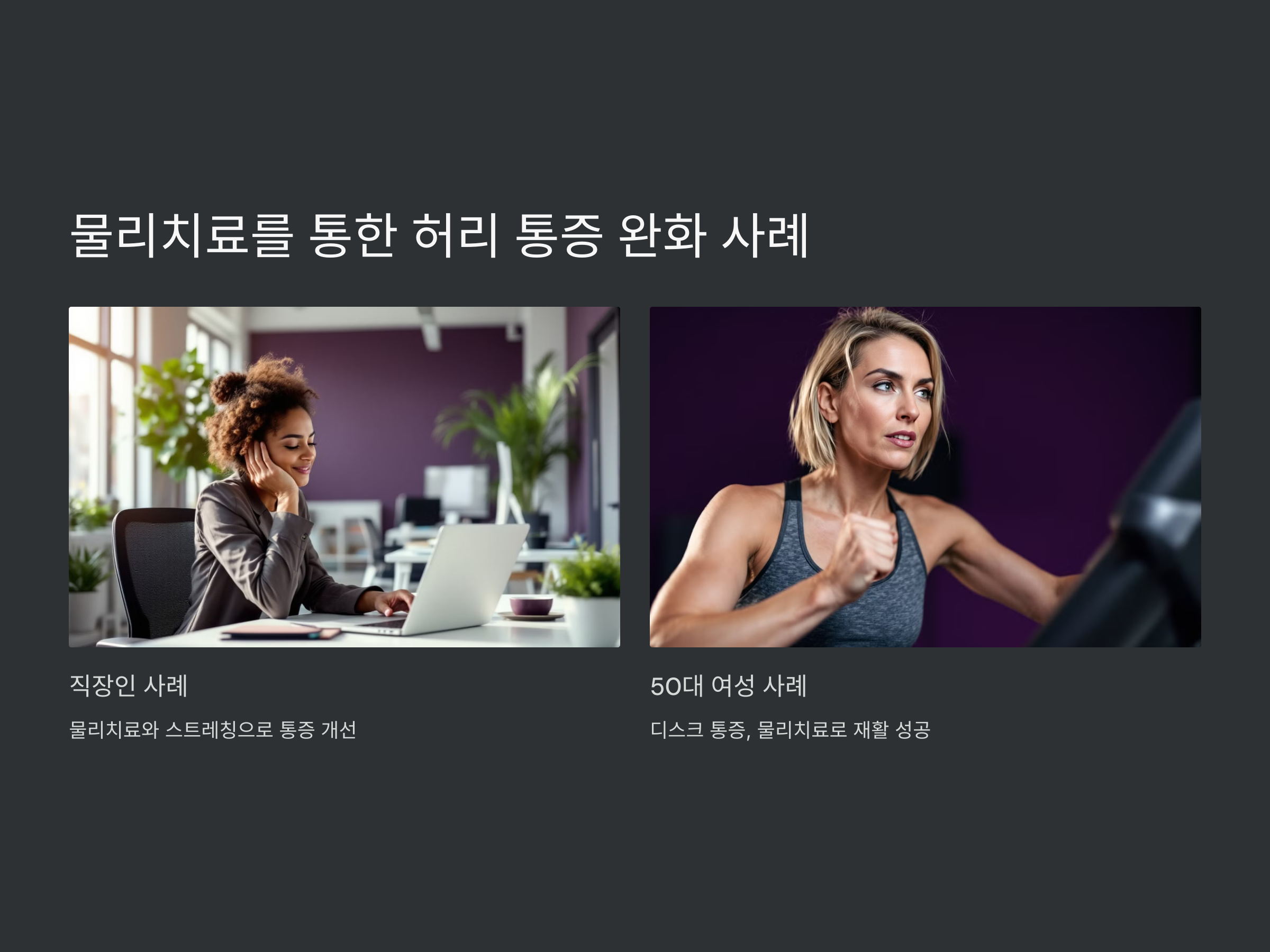 또 다른 사례로는, 50대 여성 환자가 허리 디스크로 인한 통증을 겪었는데, 물리치료와 꾸준한 운동 치료를 통해 재활에 성공한 경우입니다. 이처럼 물리치료는 허리 통증 완화에 큰 도움이 되며, 적극적인 치료와 생활습관 개선이 병행될 때 더욱 효과적입니다.