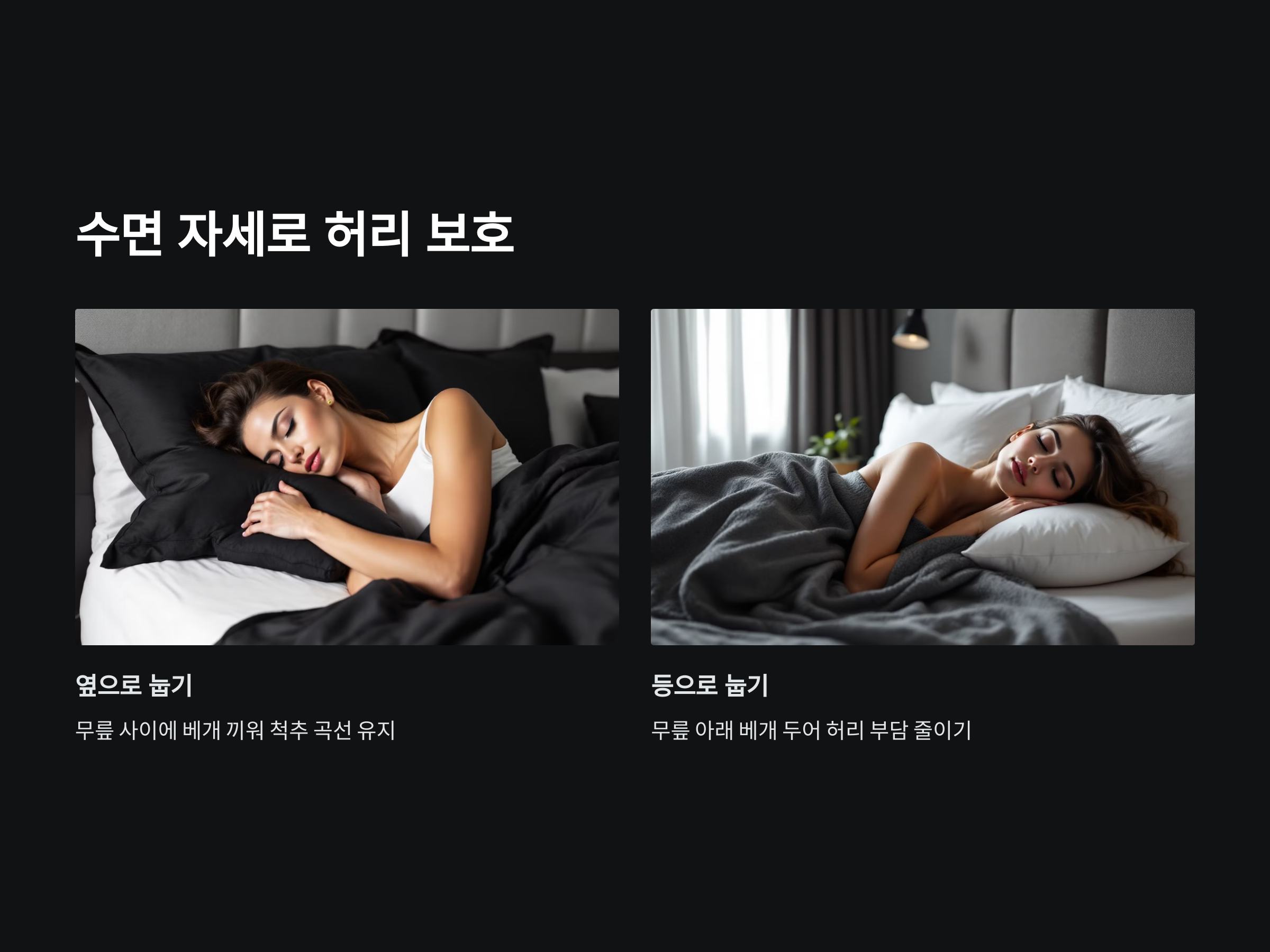 - 옆으로 눕기: 무릎 사이에 베개를 끼워 척추의 곡선을 유지합니다.