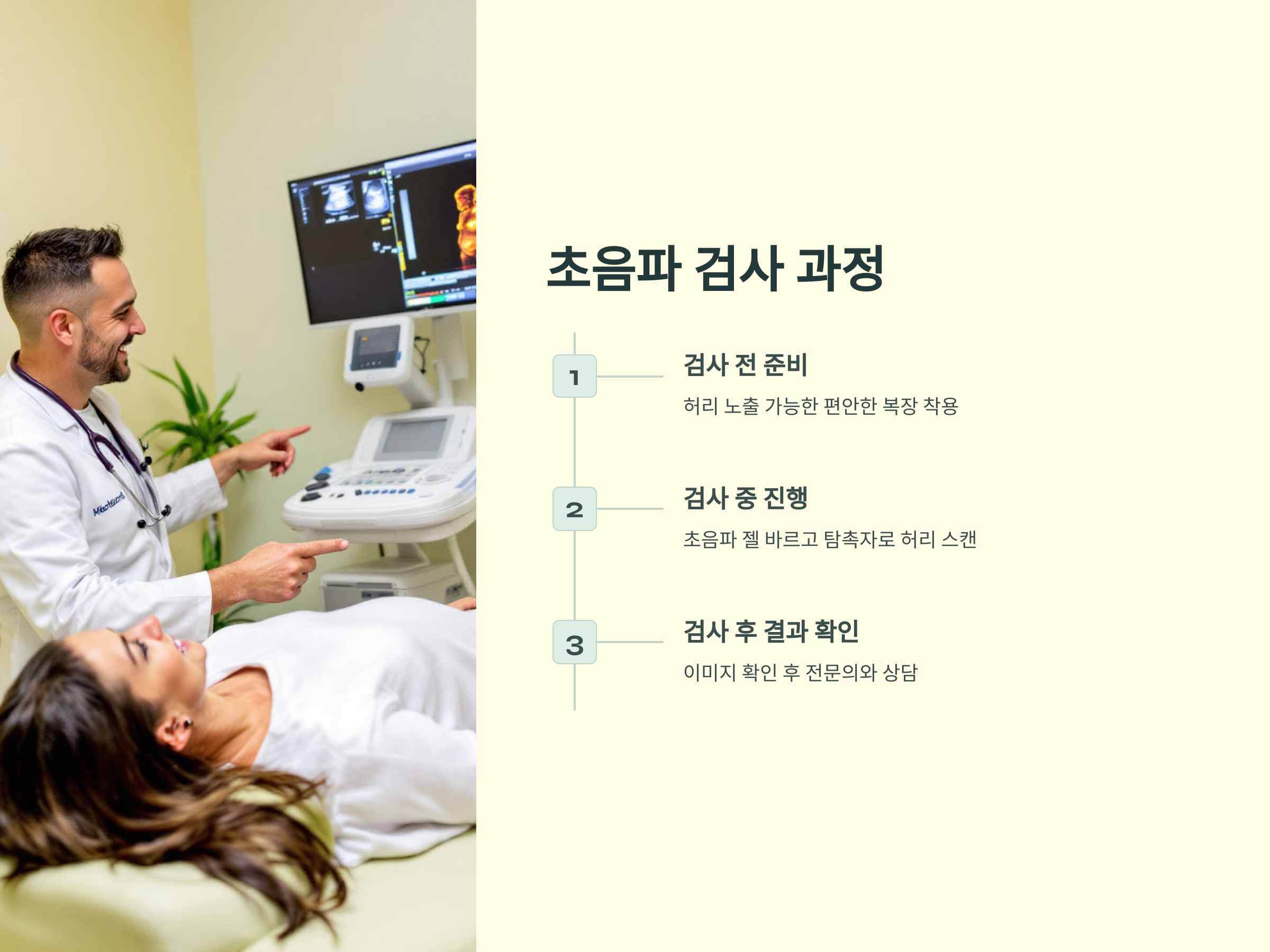 - 검사 중 진행: 초음파 젤을 바른 후 탐촉자로 허리 부위를 스캔합니다.
