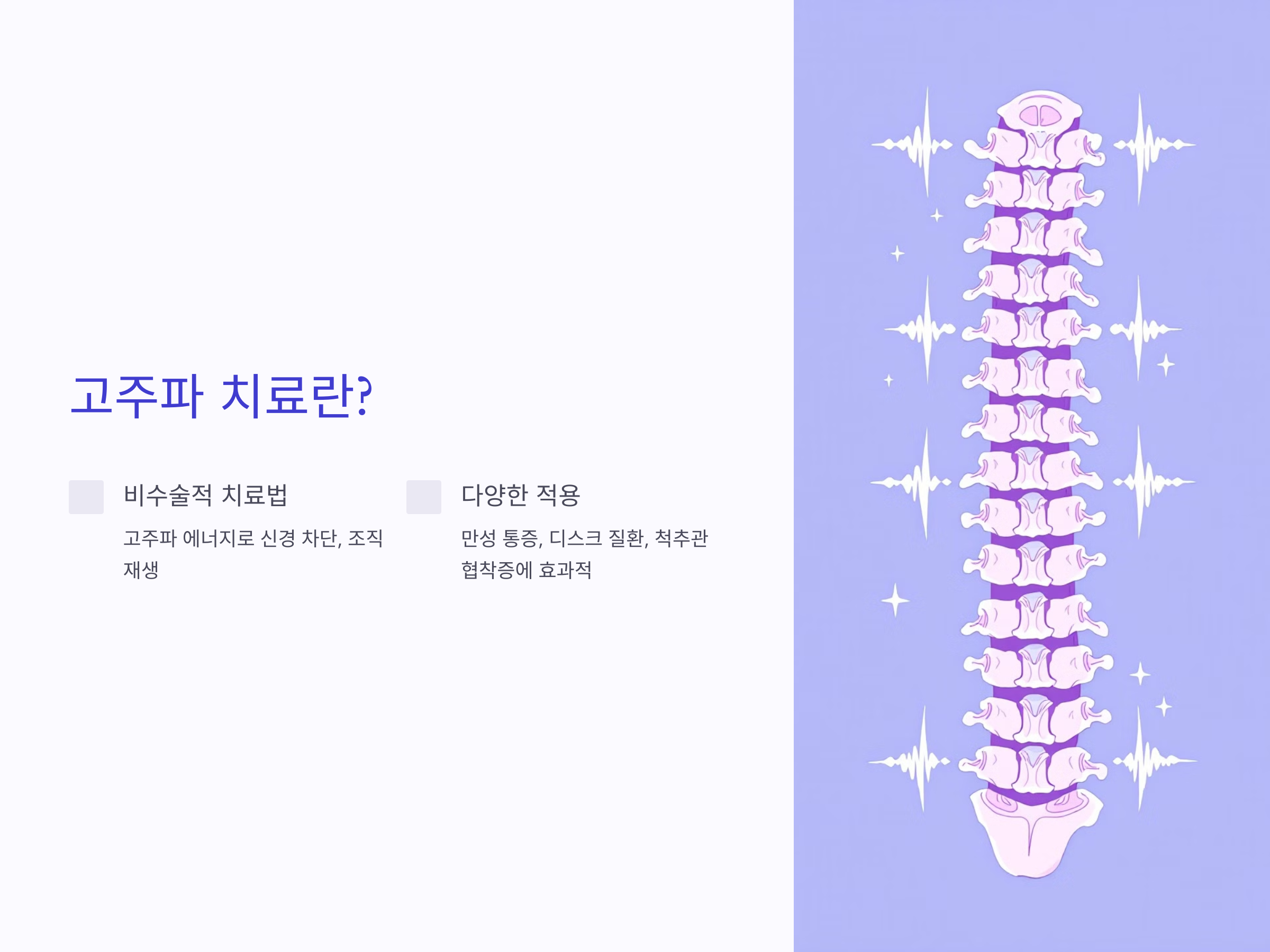 고주파 치료는 고주파 에너지를 이용해 신경을 차단하거나 조직을 재생하는 방식으로 허리 통증을 줄이는 비수술적 치료 방법입니다. 특히 만성 통증, 디스크 질환, 척추관 협착증 등 다양한 허리 질환에 효과적으로 적용됩니다.