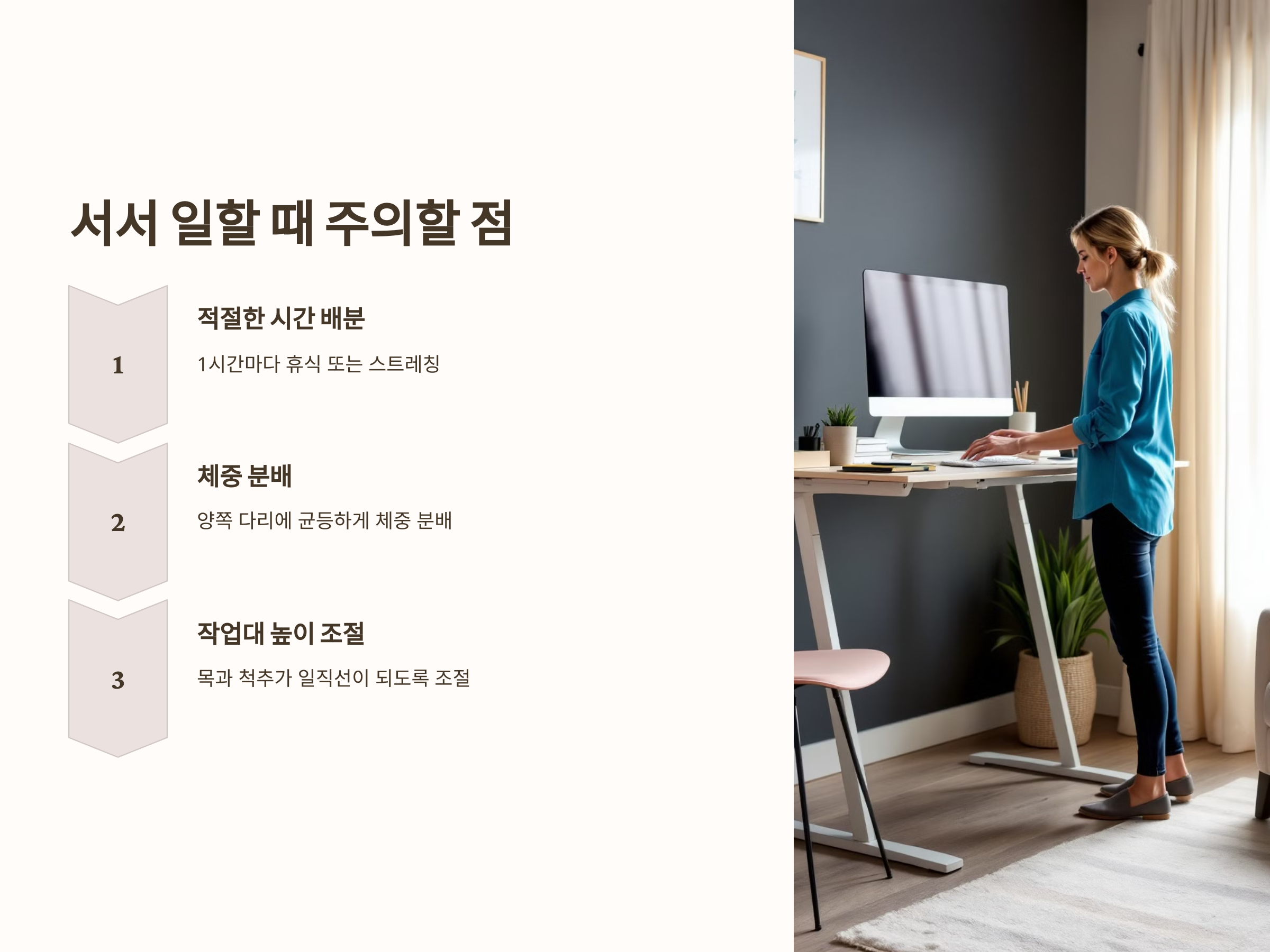 서서 일하기, 허리 통증 예방, 직장 건강, 스탠딩 데스크, 올바른 자세, 스트레칭, 발 받침대, 체중 분배, 허리 건강, 다리