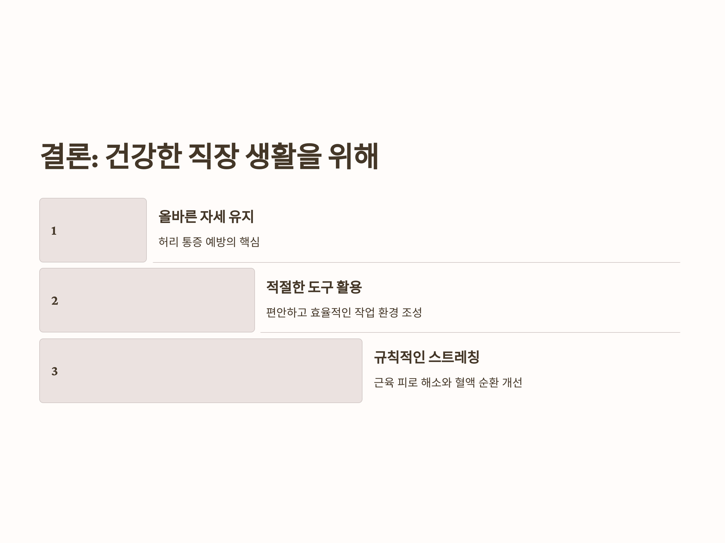 허리 통증을 예방하는 가장 효과적인 방법 중 하나는 서서 일하는 자세를 개선하는 것입니다. 올바른 자세로 서는 것만으로도 허리에 가해지는 부담을 줄일 수 있으며, 장기적으로 허리 통증 예방에 큰 도움이 됩니다. 서서 일하는 도구를 잘 활용하고, 자주 스트레칭을 하여 건강한 직장 생활을 유지하시기 바랍니다.