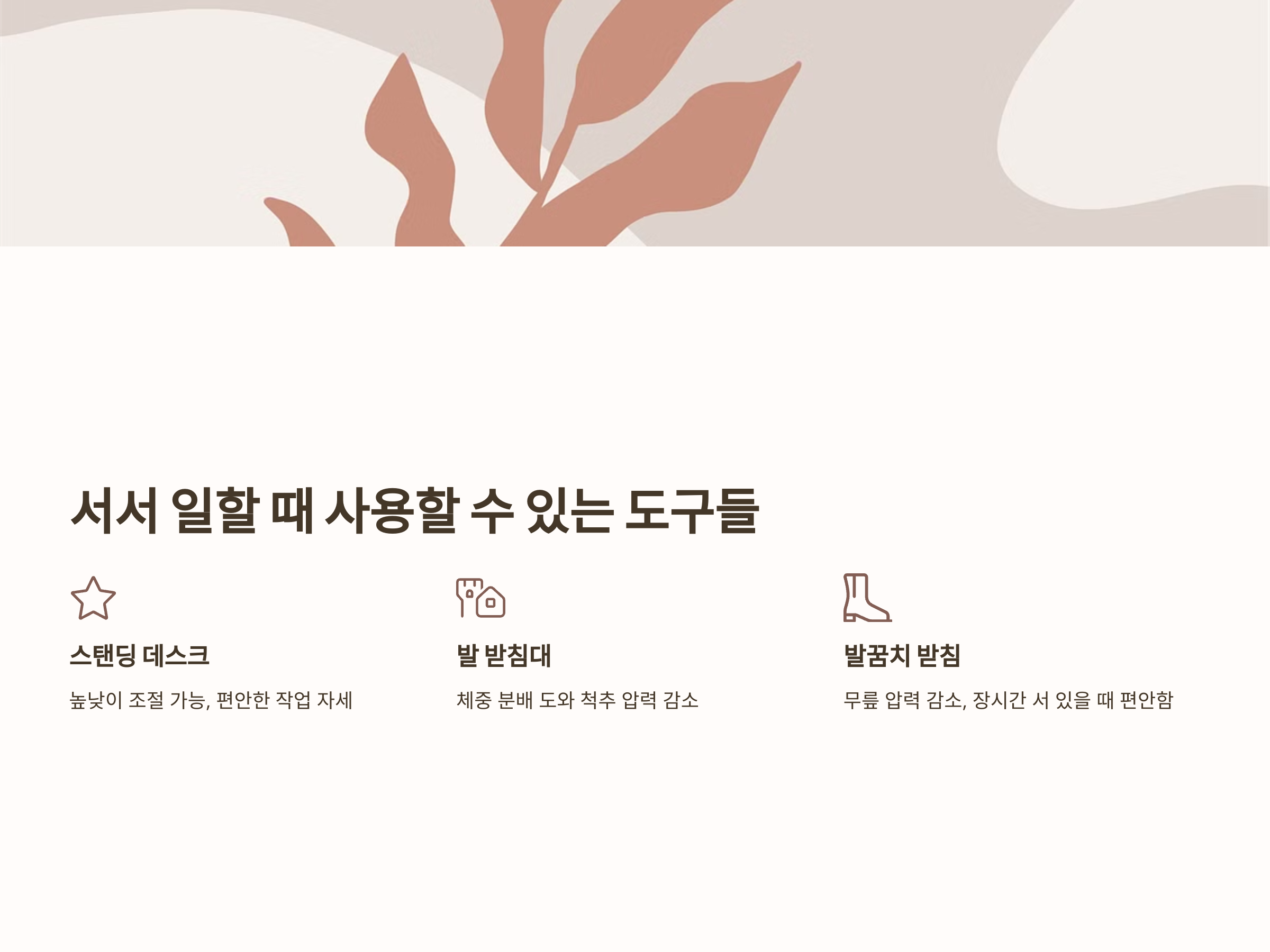 서서 일할 때 발을 편안하게 놓을 수 있는 발 받침대는 필수 아이템입니다. 발 받침대는 발을 평평하게 유지해주며, 체중 분배를 고르게 도와줘 척추에 가는 압력을 줄여줍니다.