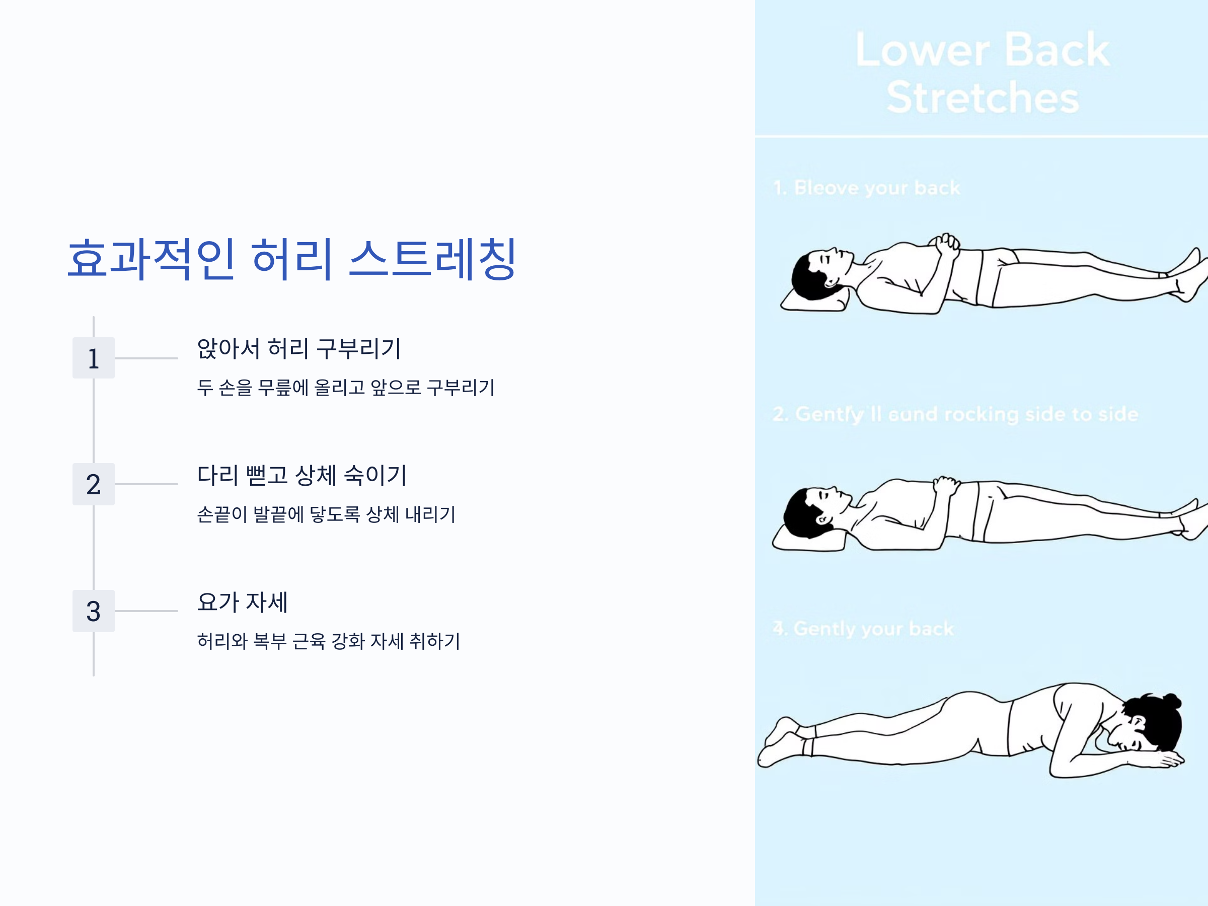 스트레칭과 운동은 허리 통증 예방에 매우 중요한 역할을 합니다. 이를 통해 근육을 이완시키고, 유연성을 높여줍니다.