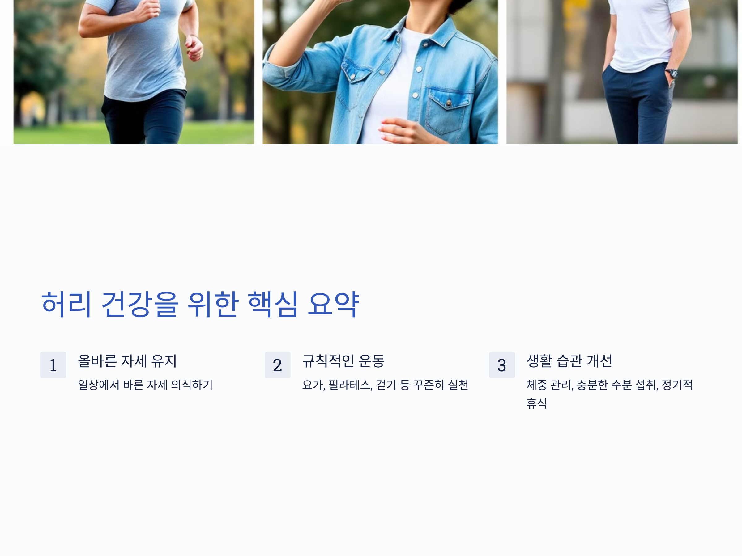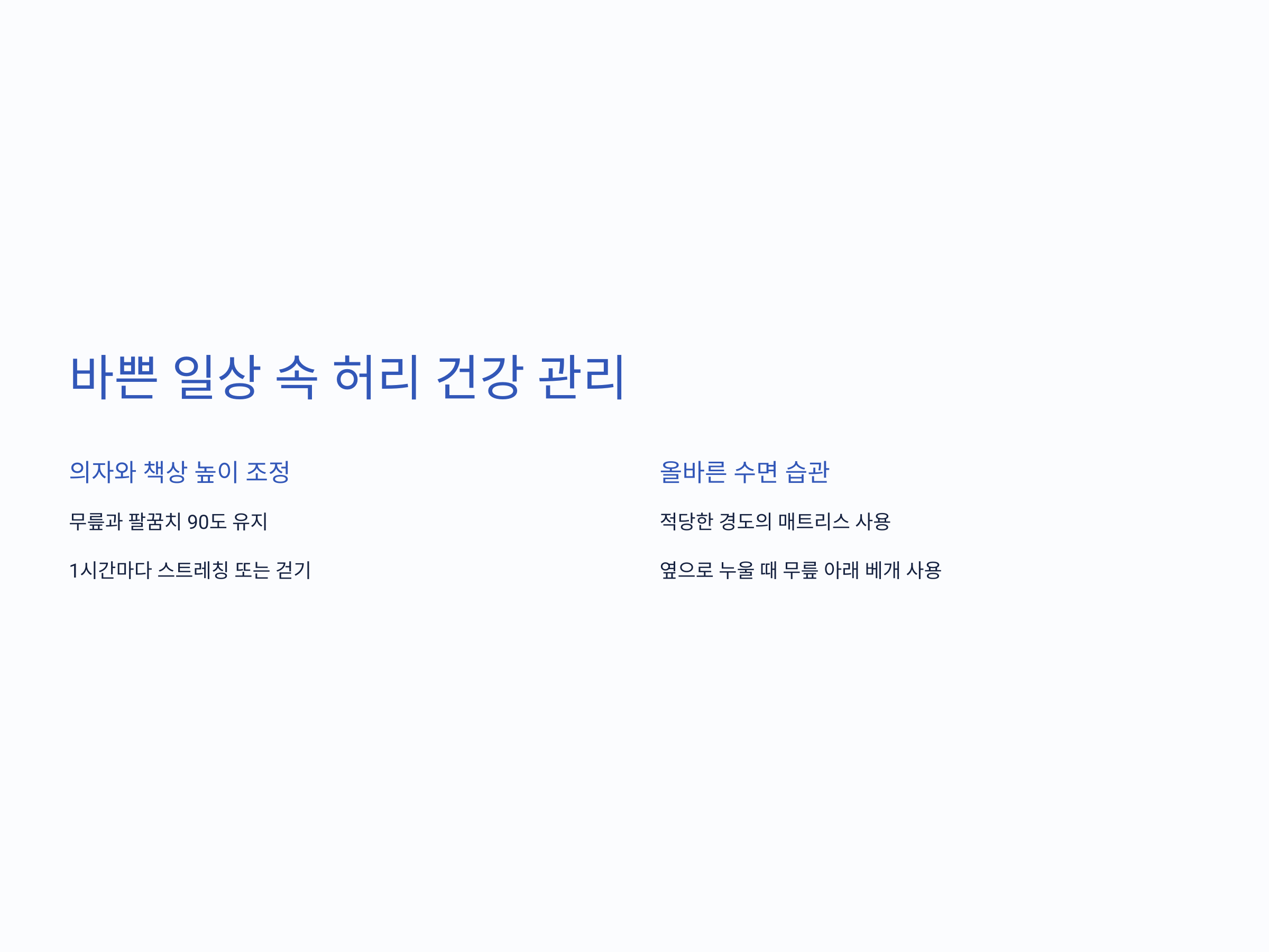 허리 통증을 예방하기 위해서는 생활 속에서 몇 가지 중요한 습관을 개선해야 합니다. 이를 실천함으로써 장기적으로 허리 건강을 유지할 수 있습니다.
