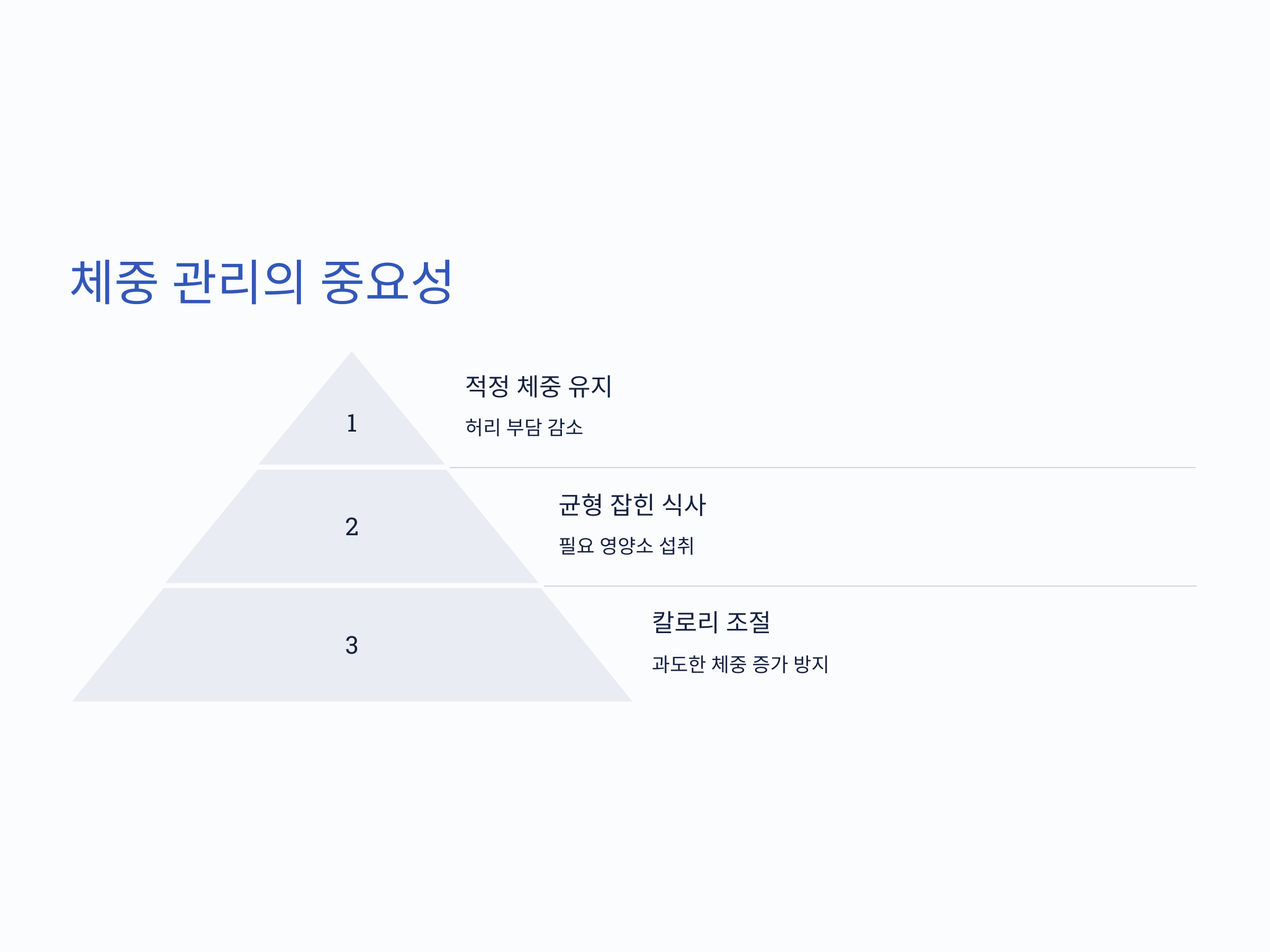 비만은 허리 통증의 주요 원인 중 하나이기 때문에, 적정 체중을 유지하는 것이 중요합니다. 체중이 과도하게 증가하면 허리에 가는 부담이 커져 허리 통증을 유발할 수 있습니다. 균형 잡힌 식사와 운동을 통해 체중을 관리하는 것이 중요하며, 하루에 필요한 칼로리를 계산하여 건강한 식습관을 유지하는 것이 좋습니다.