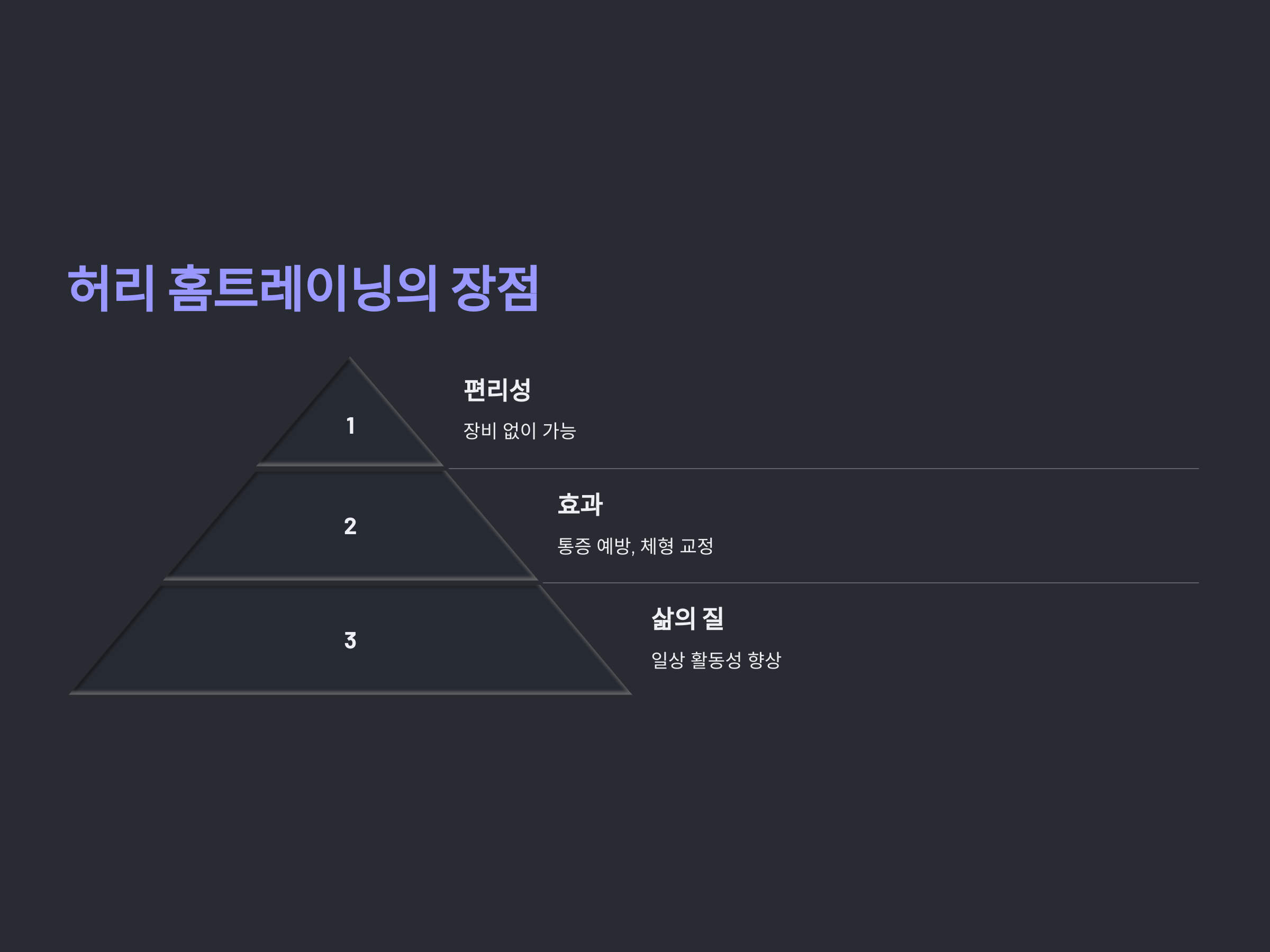 허리를 중심으로 한 코어 근육을 강화하면 체형 교정뿐 아니라 운동 효율도 높아집니다. 특히, 꾸준한 홈트레이닝은 병원 방문을 줄이고 삶의 질을 높이는 데 필수적입니다.