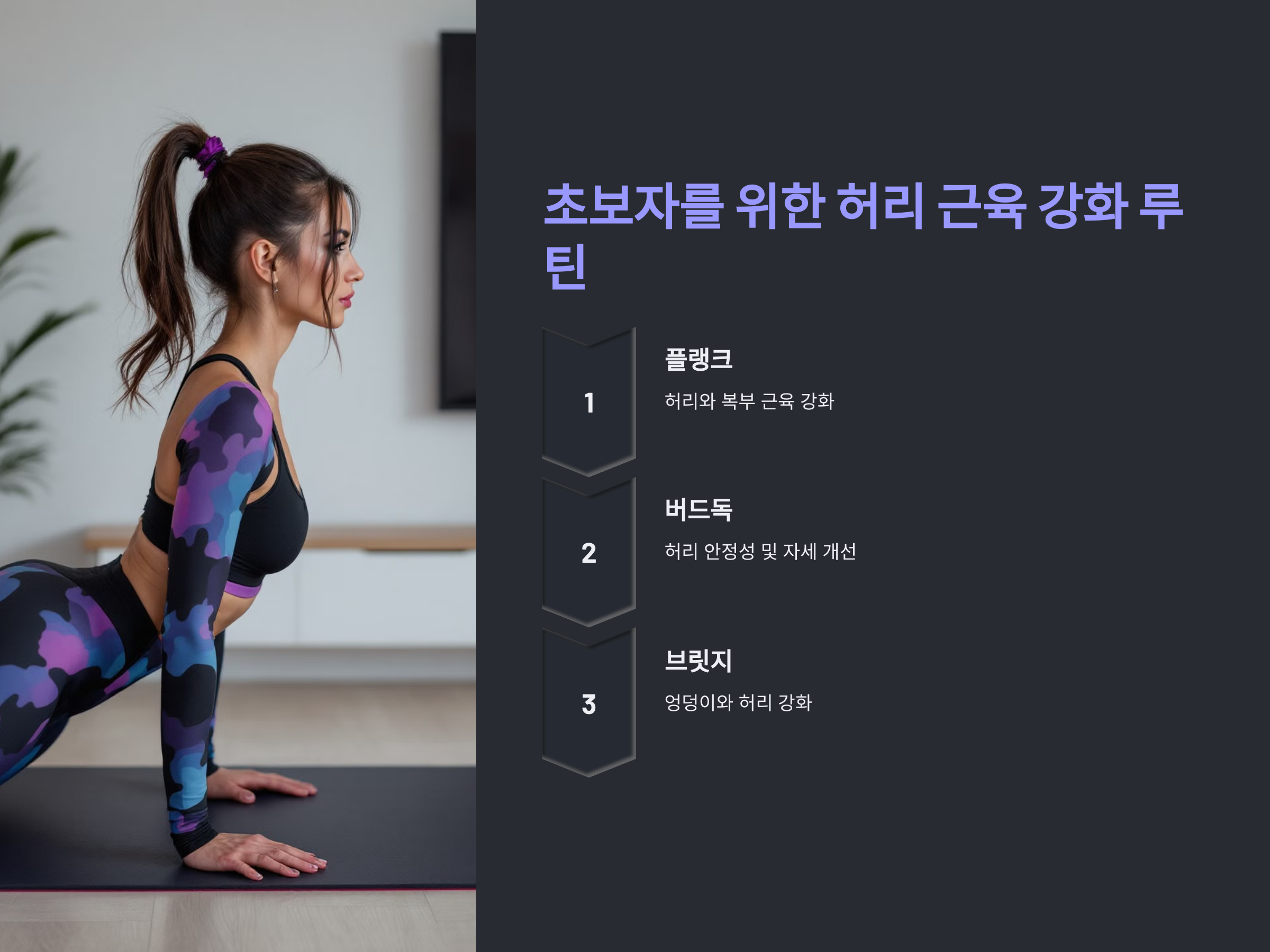 - 동작: 엎드린 자세에서 팔꿈치와 발끝으로 몸을 지탱하며 허리를 곧게 유지합니다.