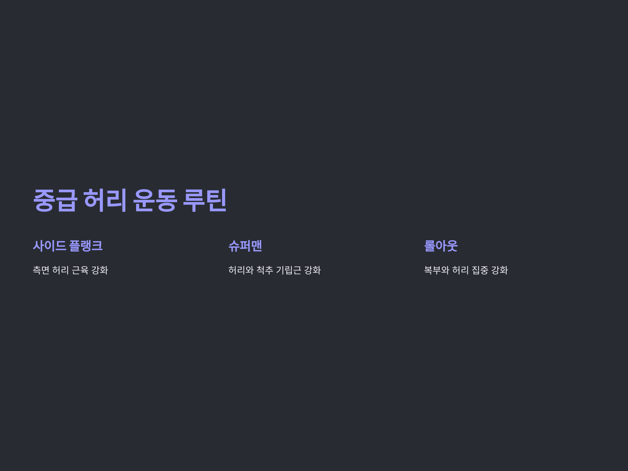 - 수요일: 중급 동작 (사이드 플랭크, 슈퍼맨)