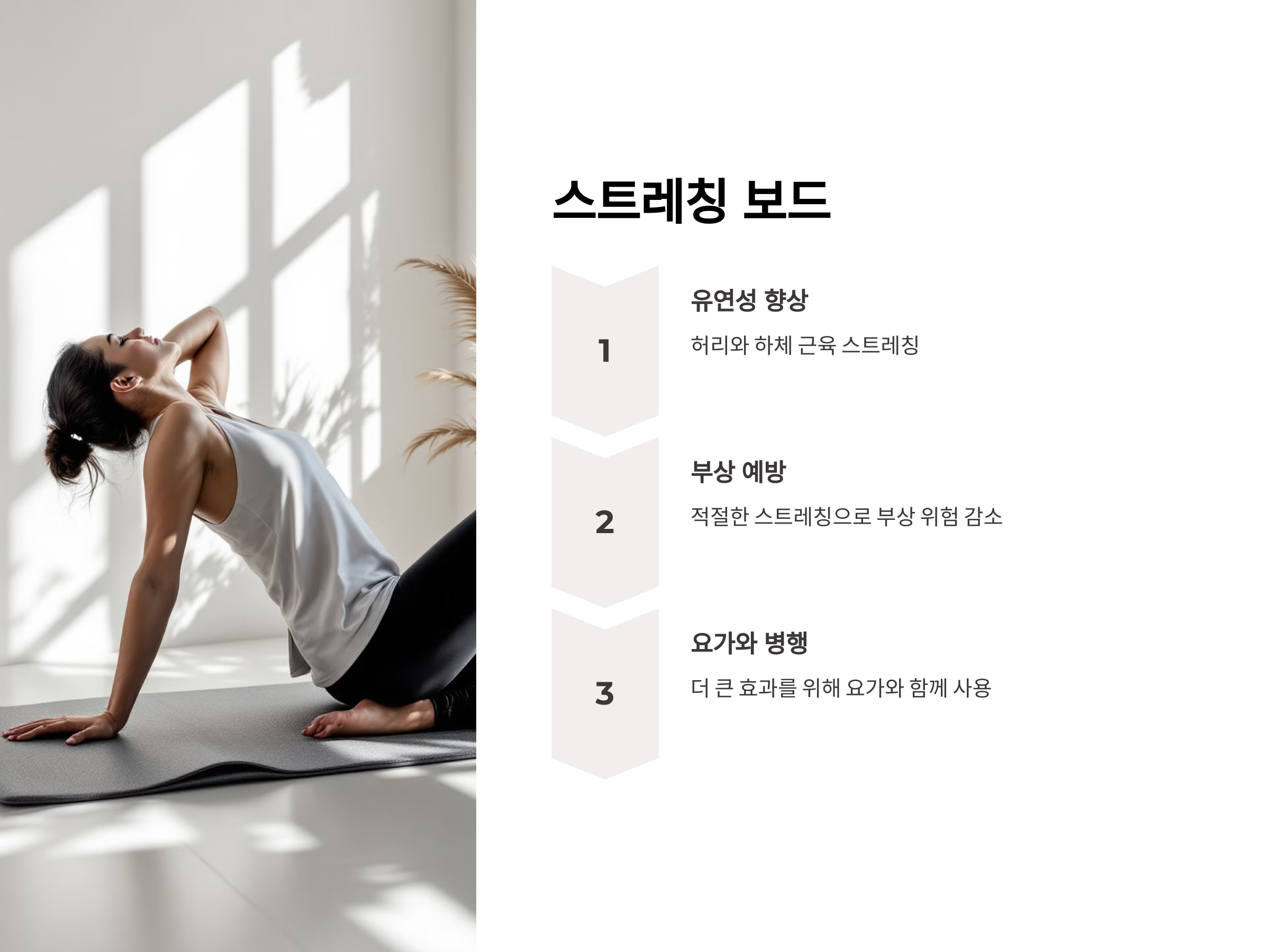 스트레칭 보드는 허리와 하체 근육을 유연하게 만들어 통증을 완화하며 부상을 예방할 수 있습니다. 특히 요가와 병행하면 더 큰 효과를 볼 수 있습니다.