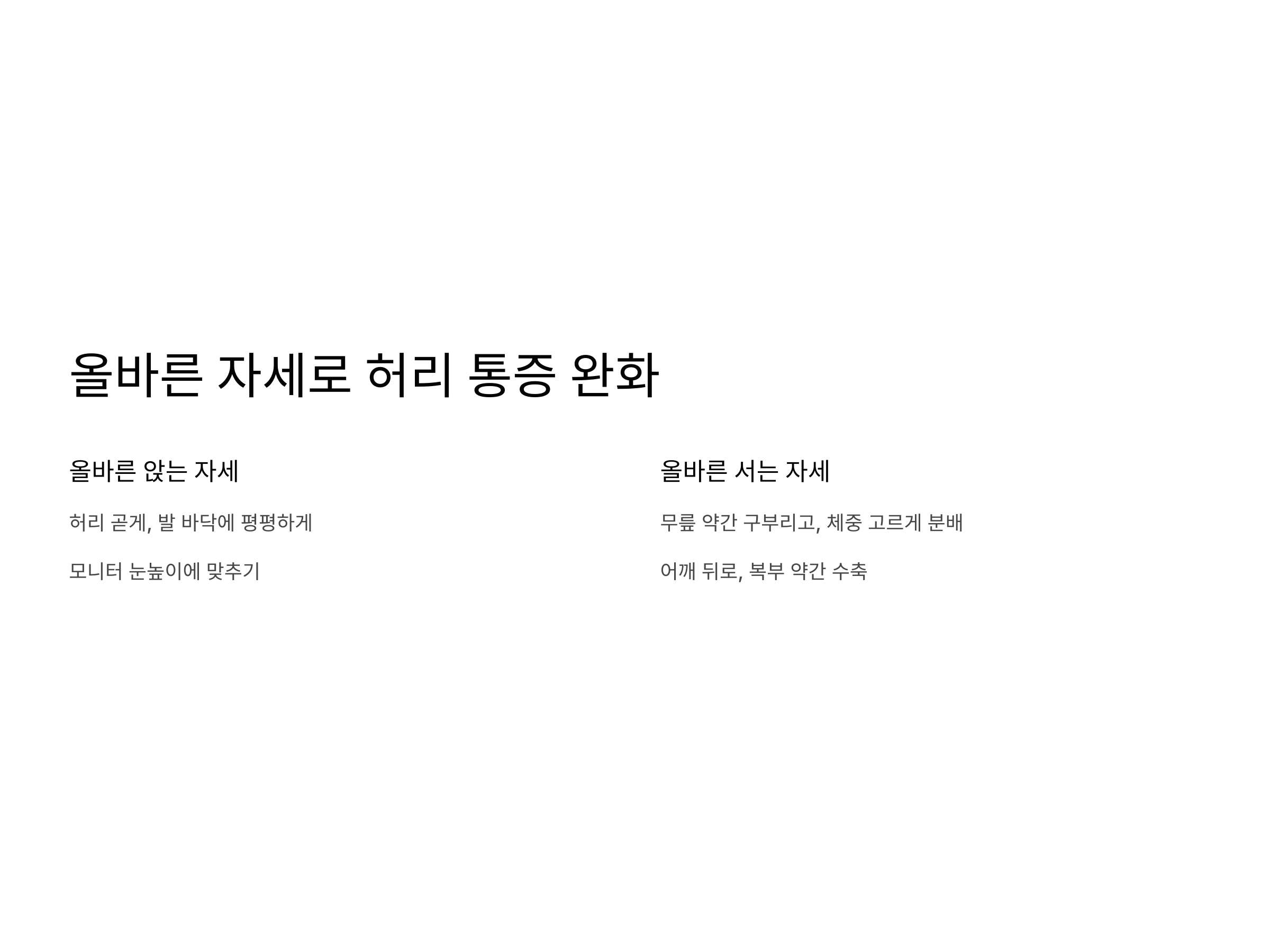 정상적인 자세를 유지하면, 허리에 부담이 덜 가고 통증이 완화됩니다.