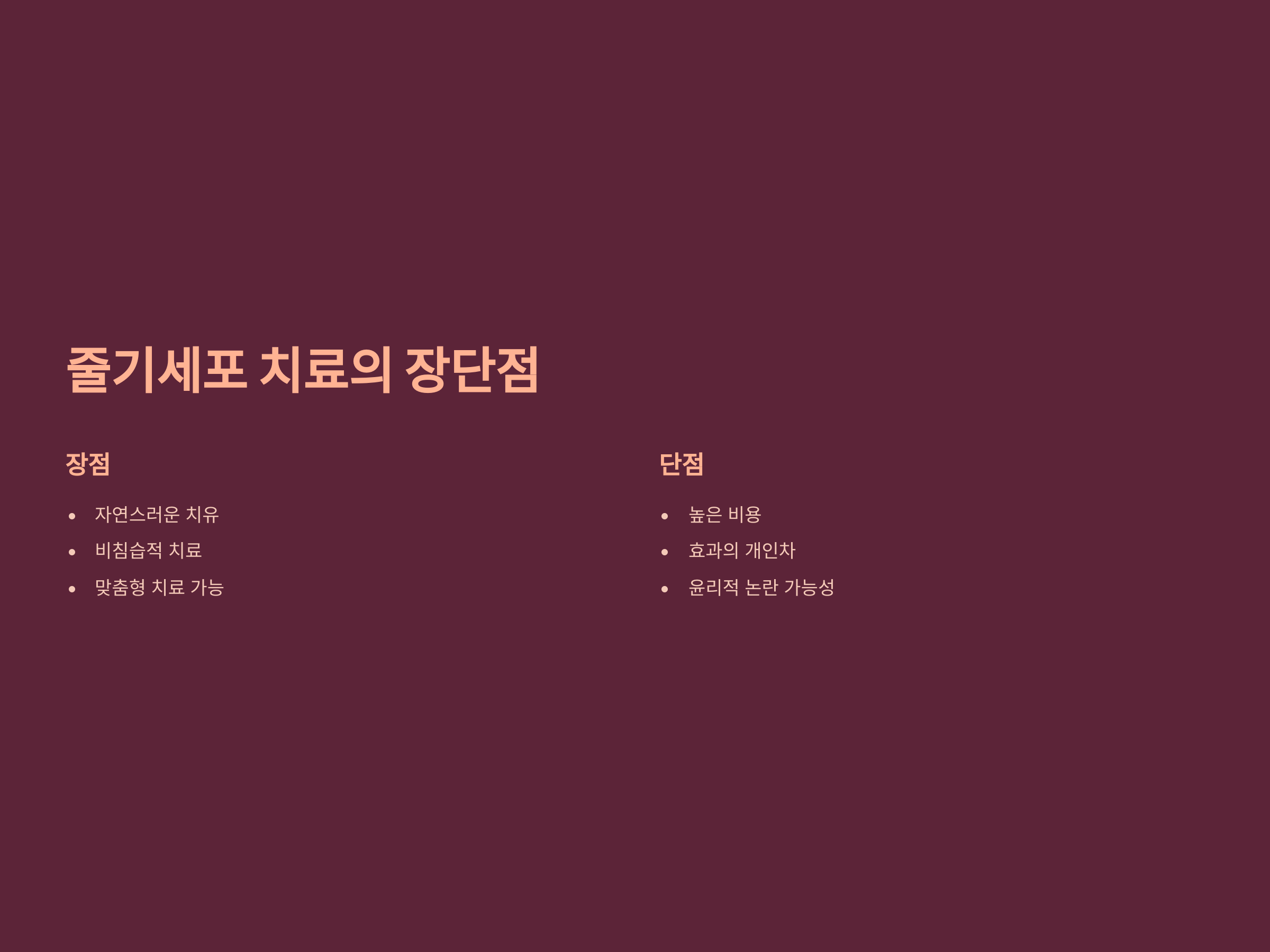 - 효과 제한: 초기 단계의 기술로 모든 환자에게 동일한 효과를 보장하지 않습니다.