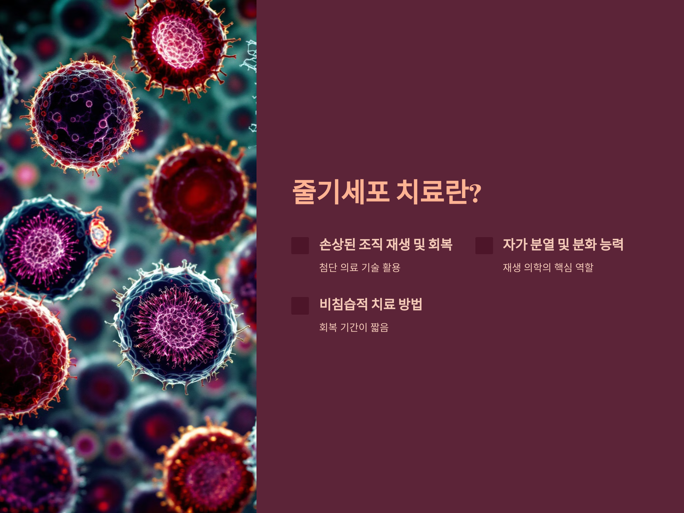 줄기세포 치료는 기존의 수술이나 약물 치료로 해결하기 어려운 문제를 해결할 가능성을 제시하며, 비침습적이면서도 회복 기간이 짧다는 장점이 있습니다.
