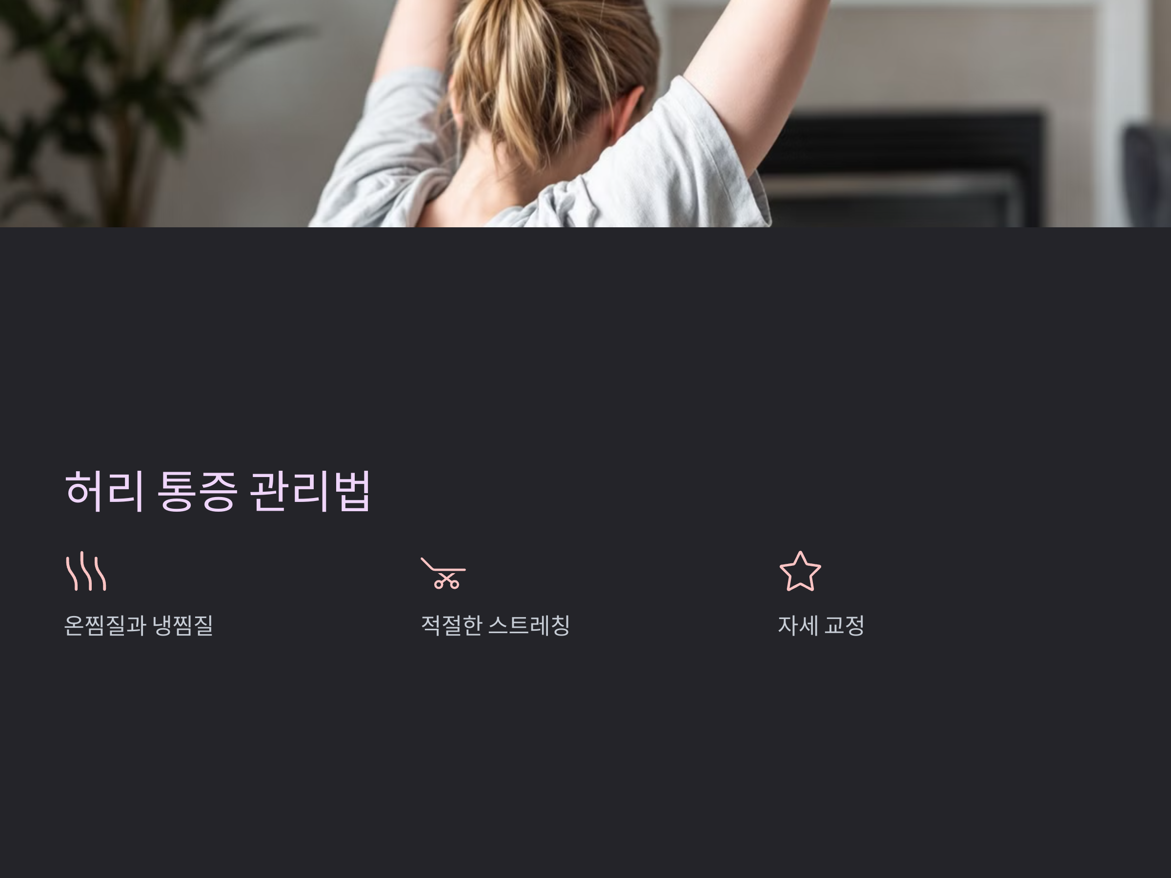 허리 통증 완화를 위해 다음과 같은 방법을 시도할 수 있습니다: