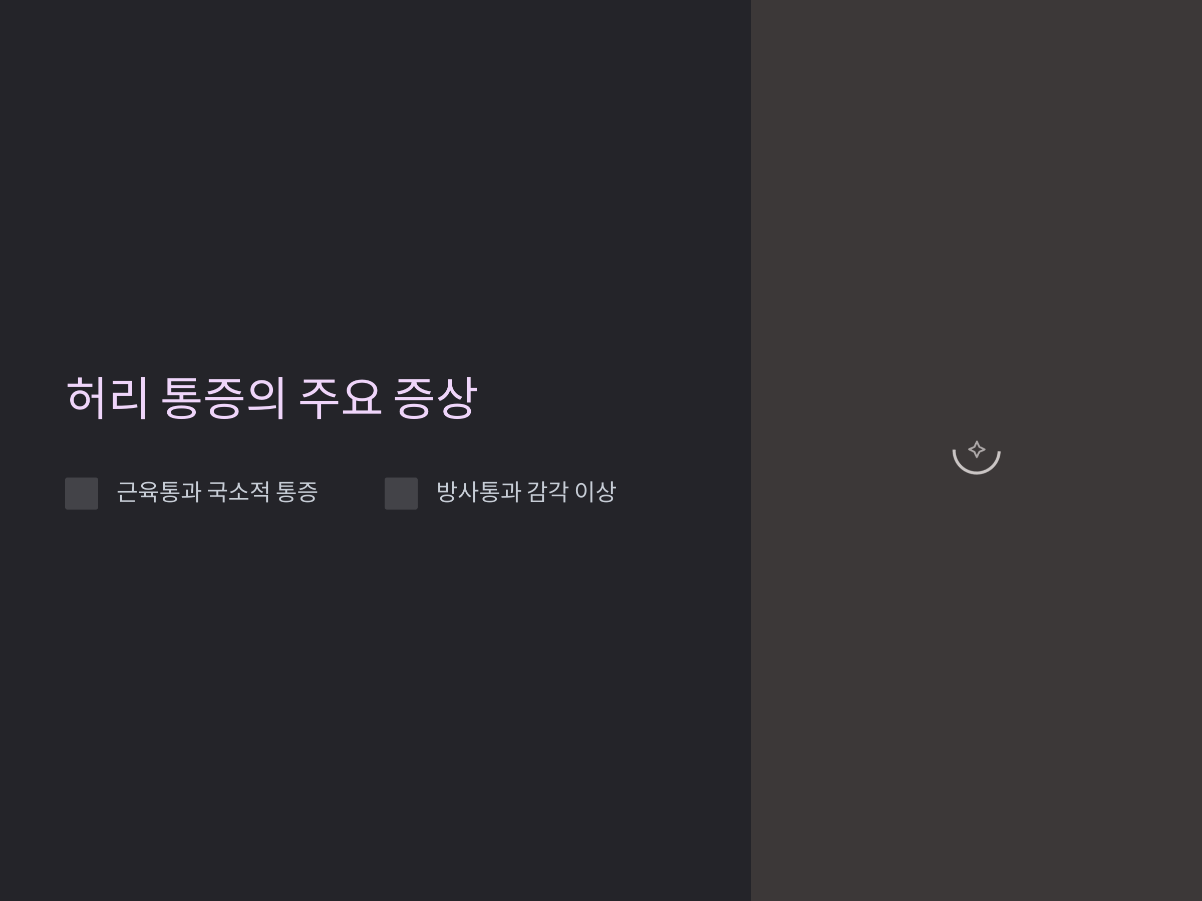 - 방사통: 허리에서 엉덩이, 다리로 뻗어나가는 통증으로 디스크 질환의 신호일 수 있음.