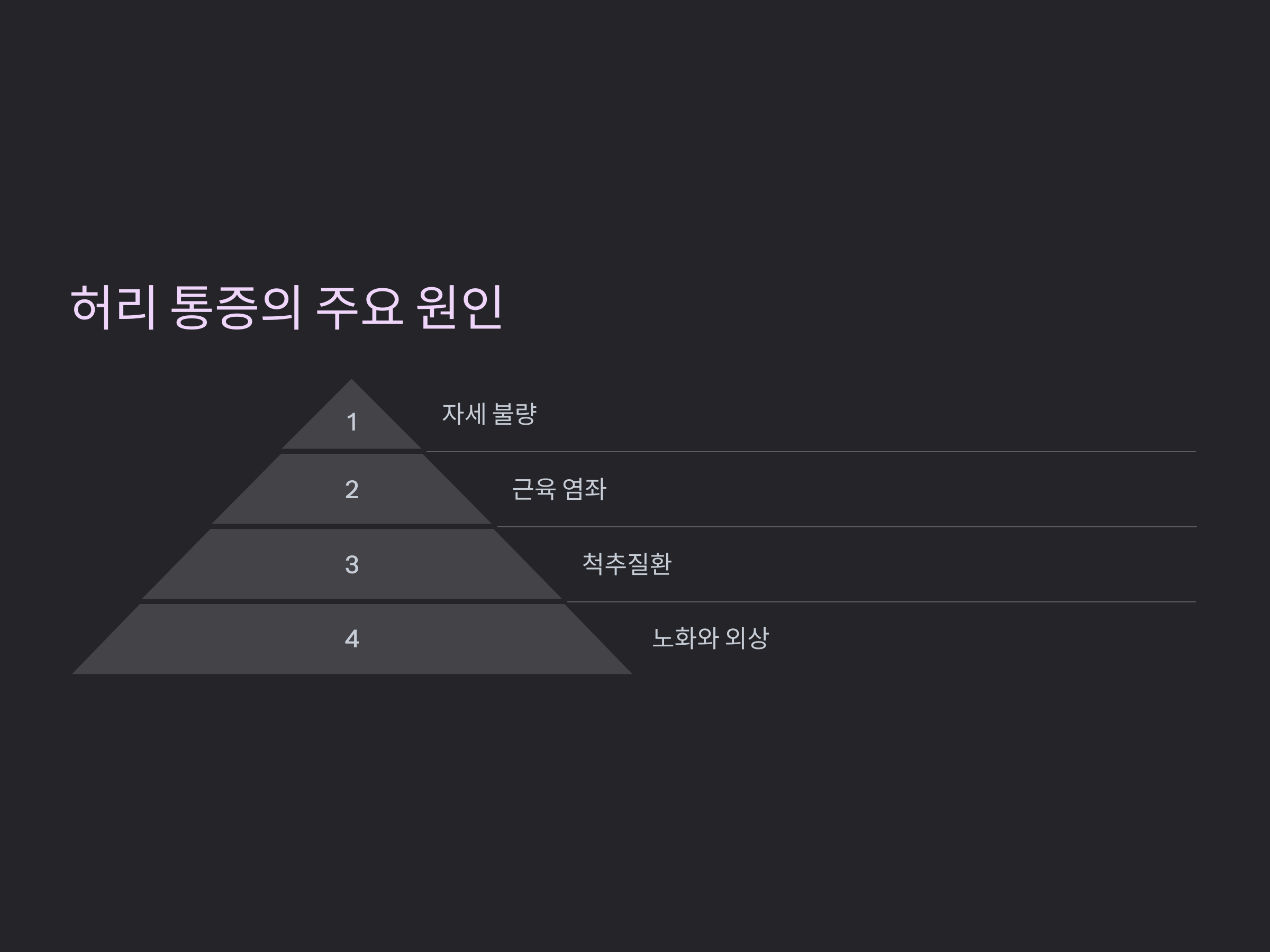 - 척추질환: 허리 디스크(추간판 탈출증), 척추관 협착증, 척추측만증 등이 주요 원인.