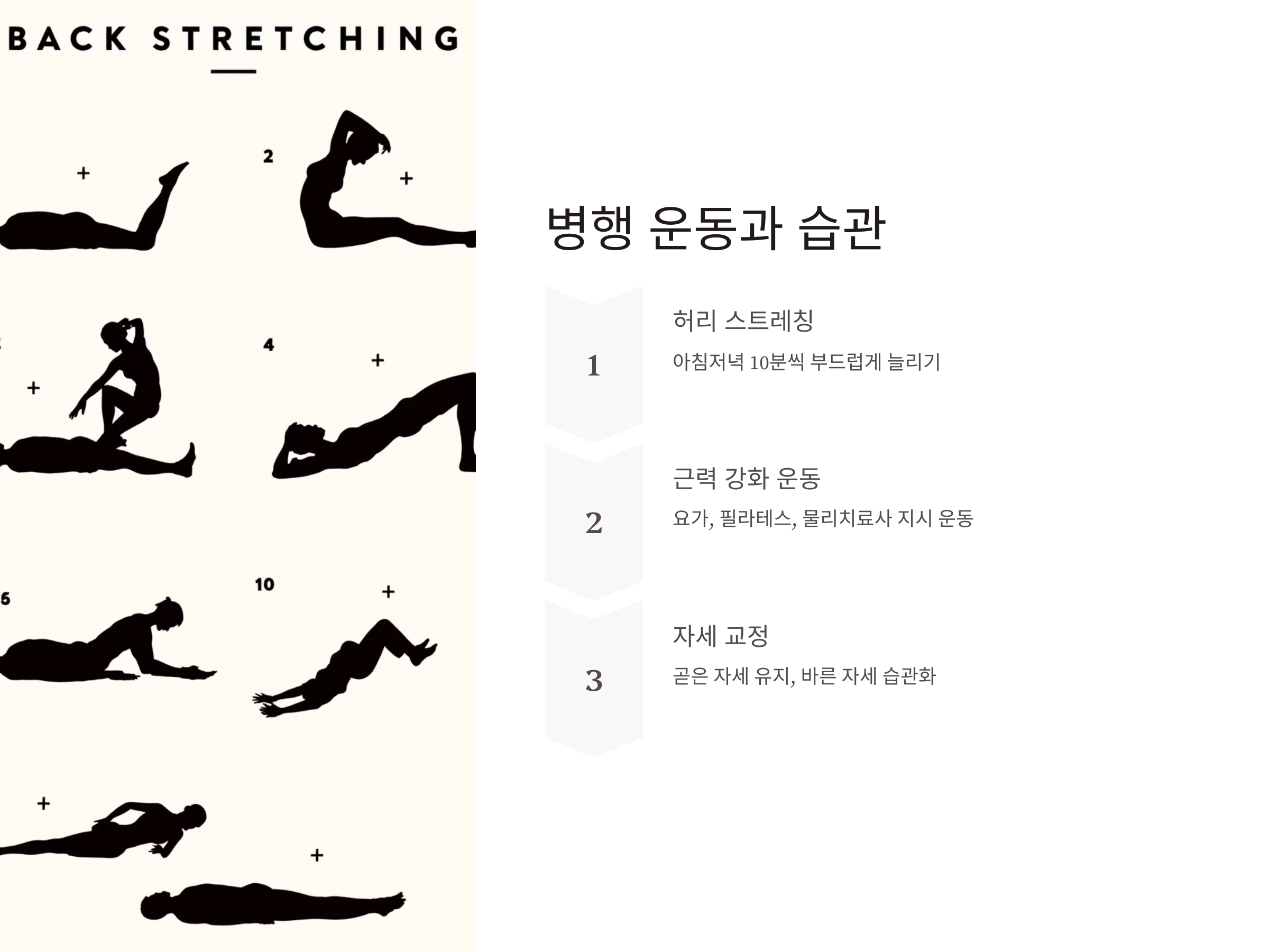 - 규칙적인 스트레칭: 하루에 최소 3회 허리와 복부 근육을 풀어주는 스트레칭을 합니다.