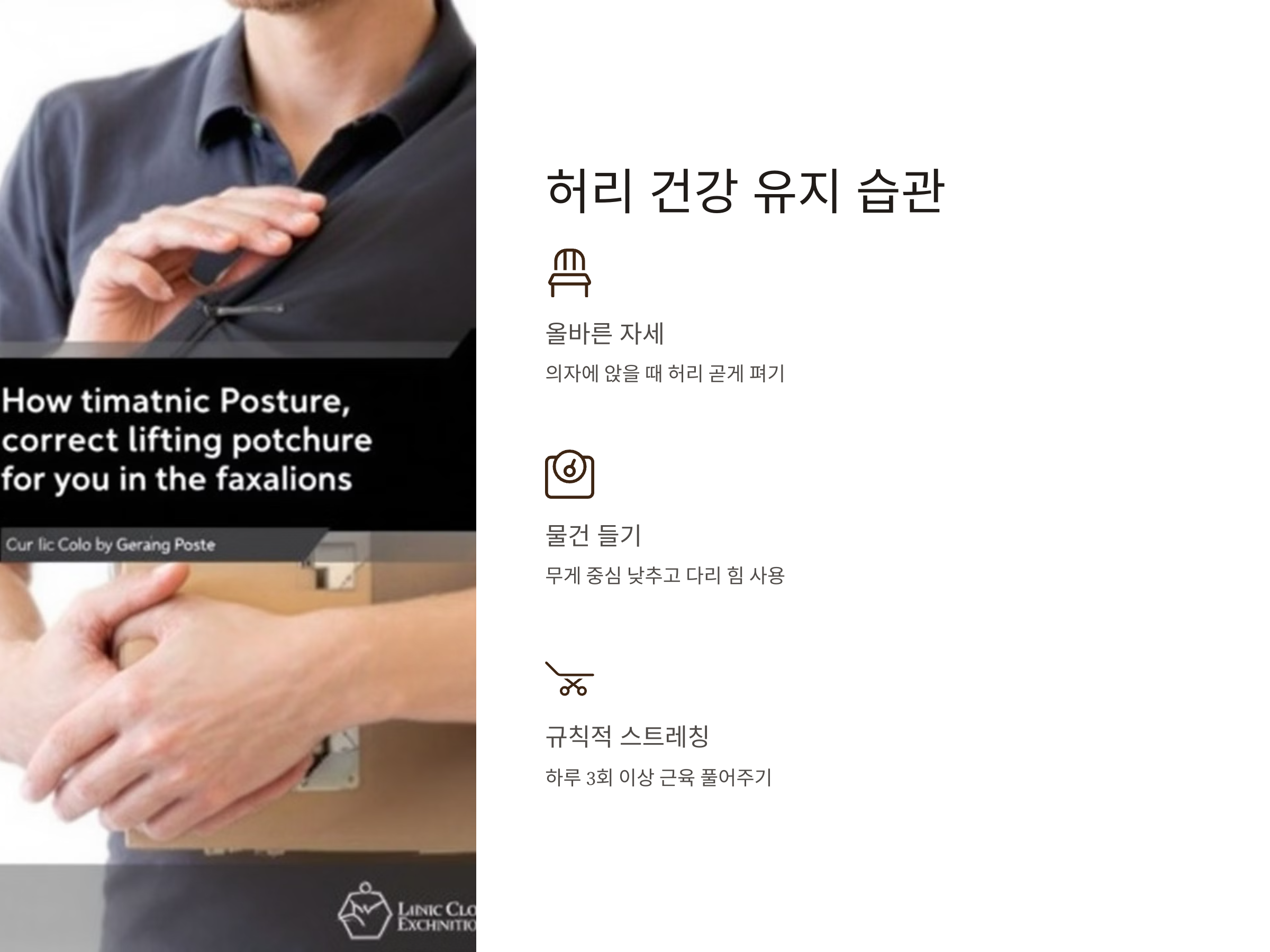 - 무거운 물건 조심히 들기: 무게 중심을 낮추고 허리 대신 다리 힘을 사용합니다.