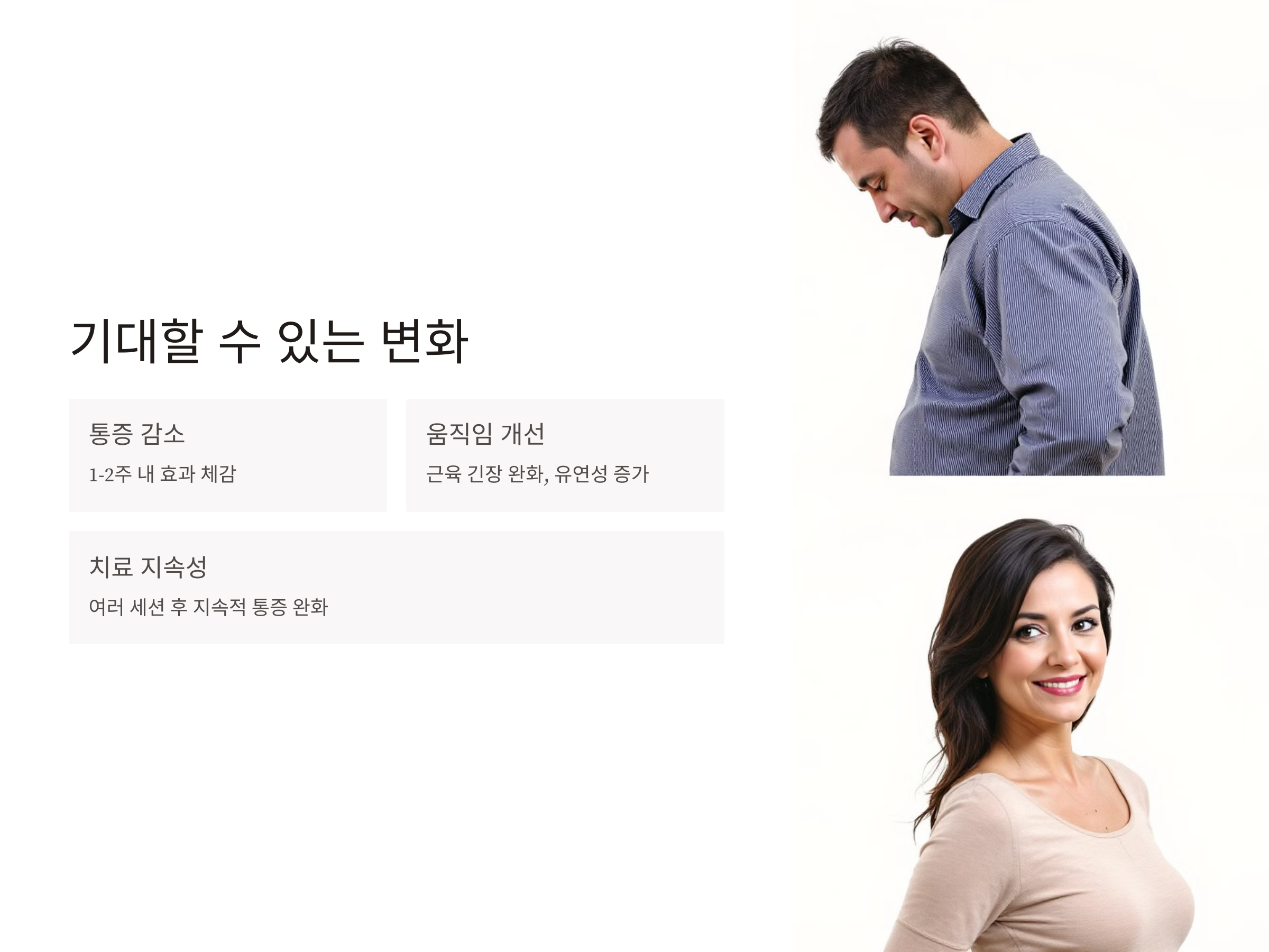 - 통증 감소: 치료 후 첫 1~2주 내에 통증이 줄어드는 효과를 느낄 수 있습니다.