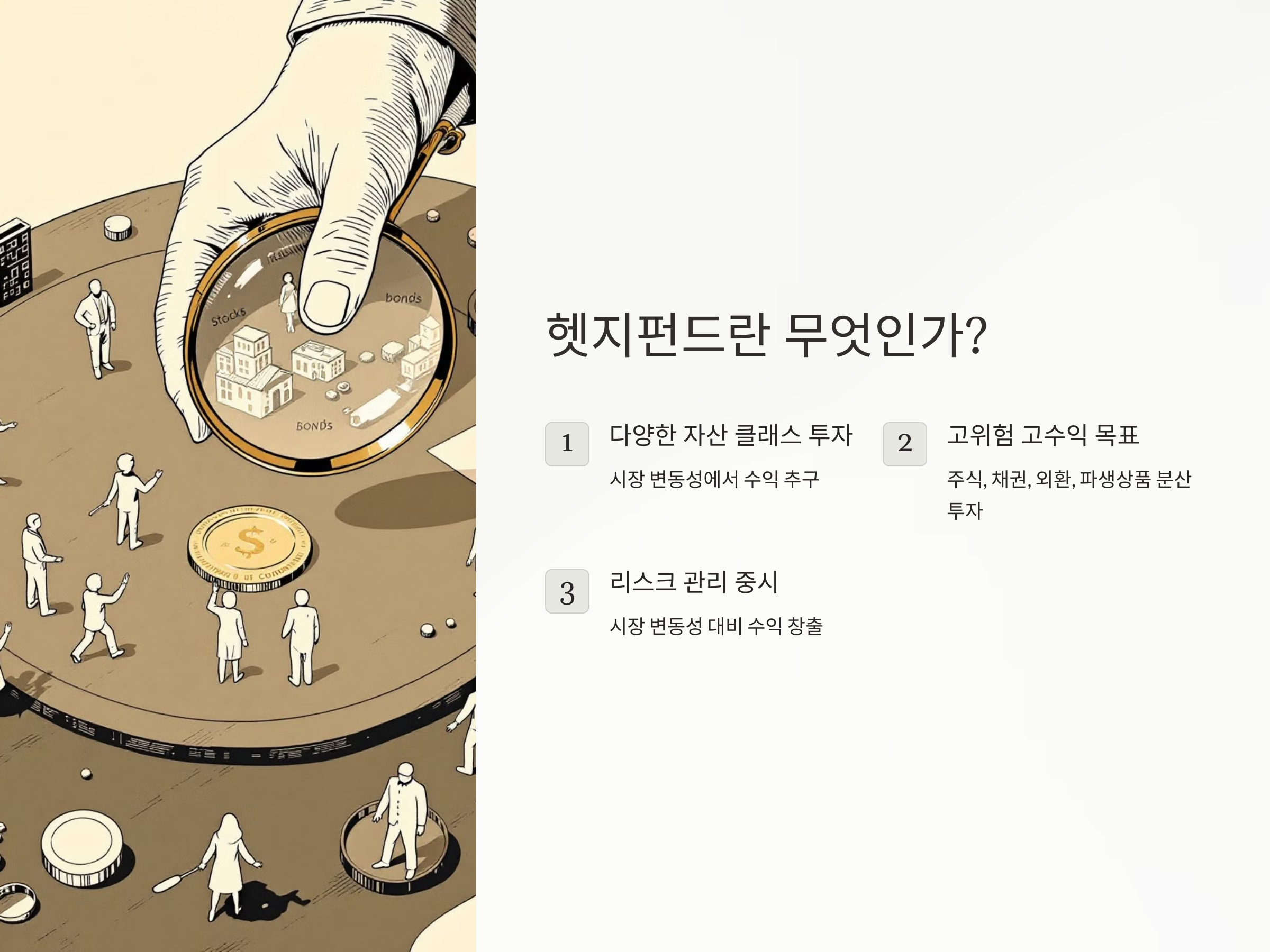 헷지펀드는 다양한 자산 클래스에 투자하는 금융 상품으로, 시장의 변동성에서 수익을 추구하는 펀드입니다. 전통적인 주식 투자나 채권 투자와는 달리, 헷지펀드는 더 큰 리스크를 감수하고 고수익을 목표로 하는 투자 방식입니다. 헷지펀드는 주식, 채권, 외환, 파생상품 등 여러 자산에 분산 투자하며, 특정 시장 조건에서도 수익을 창출할 수 있는 전략을 채택합니다.