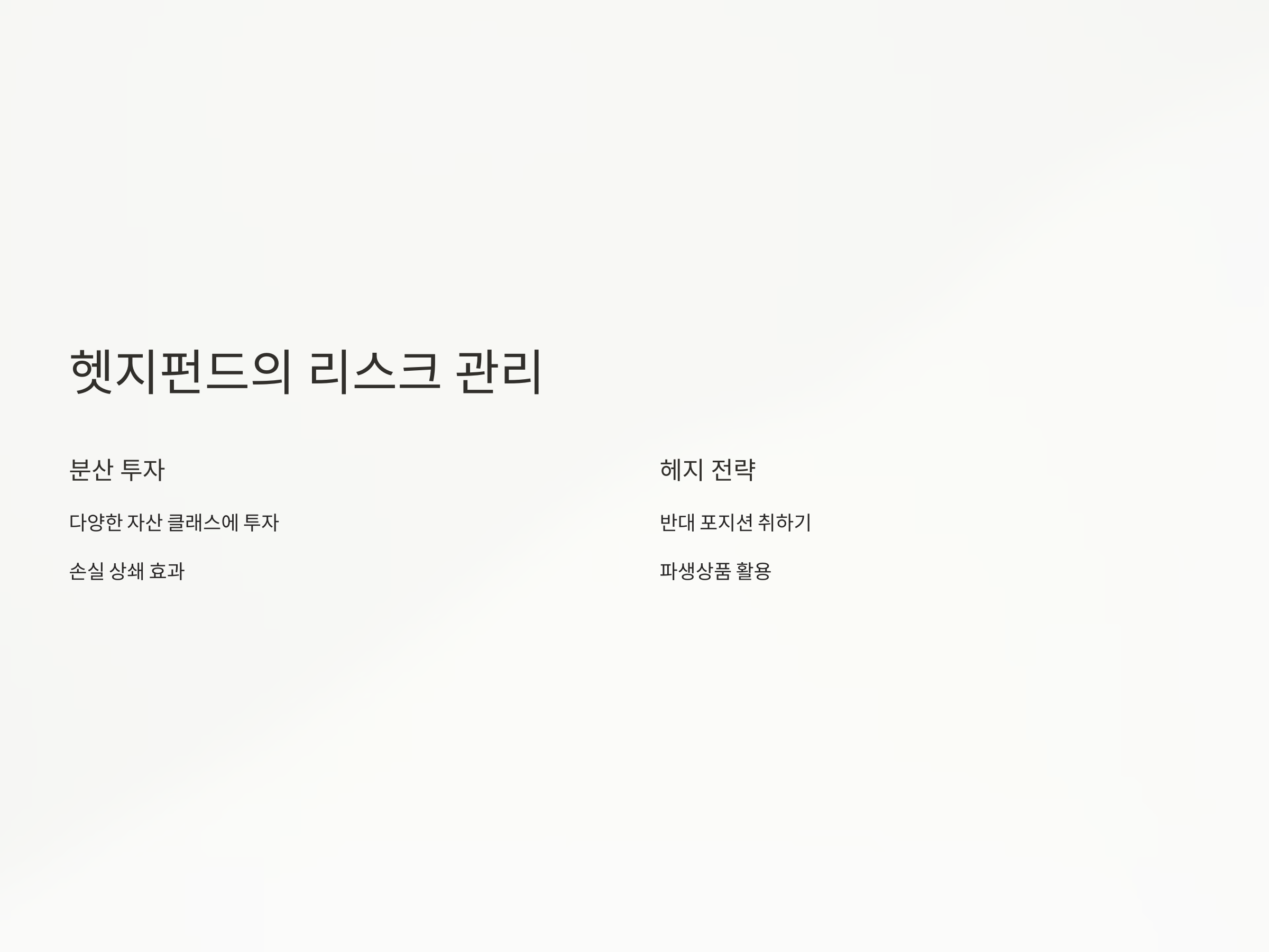 헷지펀드는 투자에서 발생할 수 있는 잠재적 손실을 최소화하기 위해 헤지 전략을 사용합니다. 헤지 전략은 특정 자산이나 시장의 하락에 대비해 반대 포지션을 취하는 방식입니다. 예를 들어, 주식의 하락에 대비해 주식 옵션을 매도하거나, 파생상품을 이용해 특정 자산군의 가격이 하락할 경우 발생할 손실을 상쇄하는 방식입니다. 헷지펀드는 이러한 헤지 전략을 통해 리스크를 적극적으로 관리하며, 시장의 변동성에 보다 안정적으로 대응할 수 있습니다.