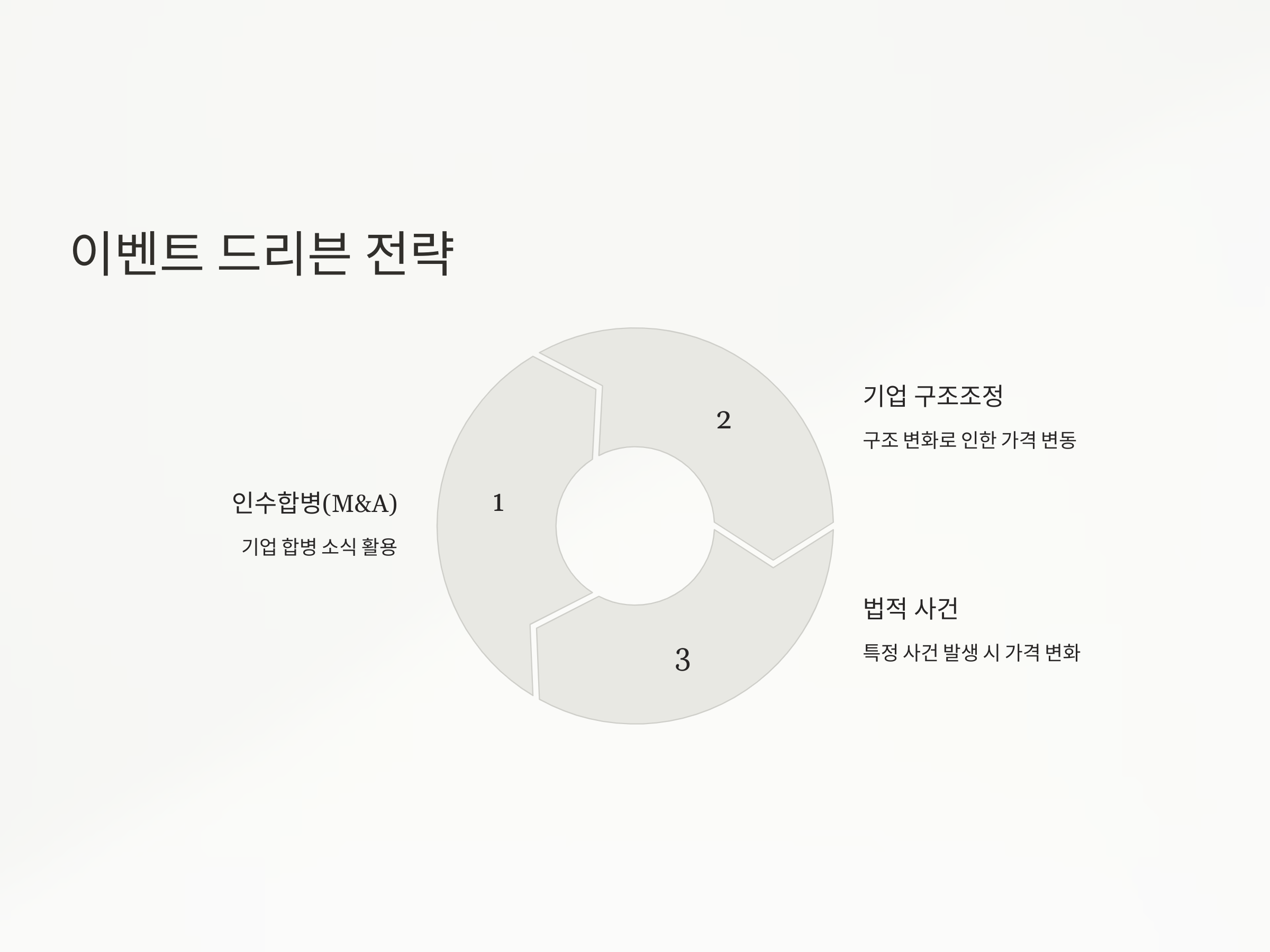 이벤트 드리븐 전략은 기업의 인수합병(M&A), 기업 구조조정, 분할, 법적 사건 등 특정 사건에 의해 발생하는 가격 변동을 이용하는 전략입니다. 예를 들어, 기업의 인수합병 소식이 발표되면, 해당 기업의 주식 가격이 급등할 가능성이 큽니다. 이런 상황에서 헷지펀드는 관련 주식을 미리 매수하여 수익을 올리거나, 반대로 인수합병을 반대하는 측의 주식을 매도할 수도 있습니다. 이러한 이벤트 드리븐 전략은 매우 세밀한 시장 분석과 예측이 요구되며, 때때로 대규모 수익을 올릴 수 있는 기회를 제공하기도 합니다.