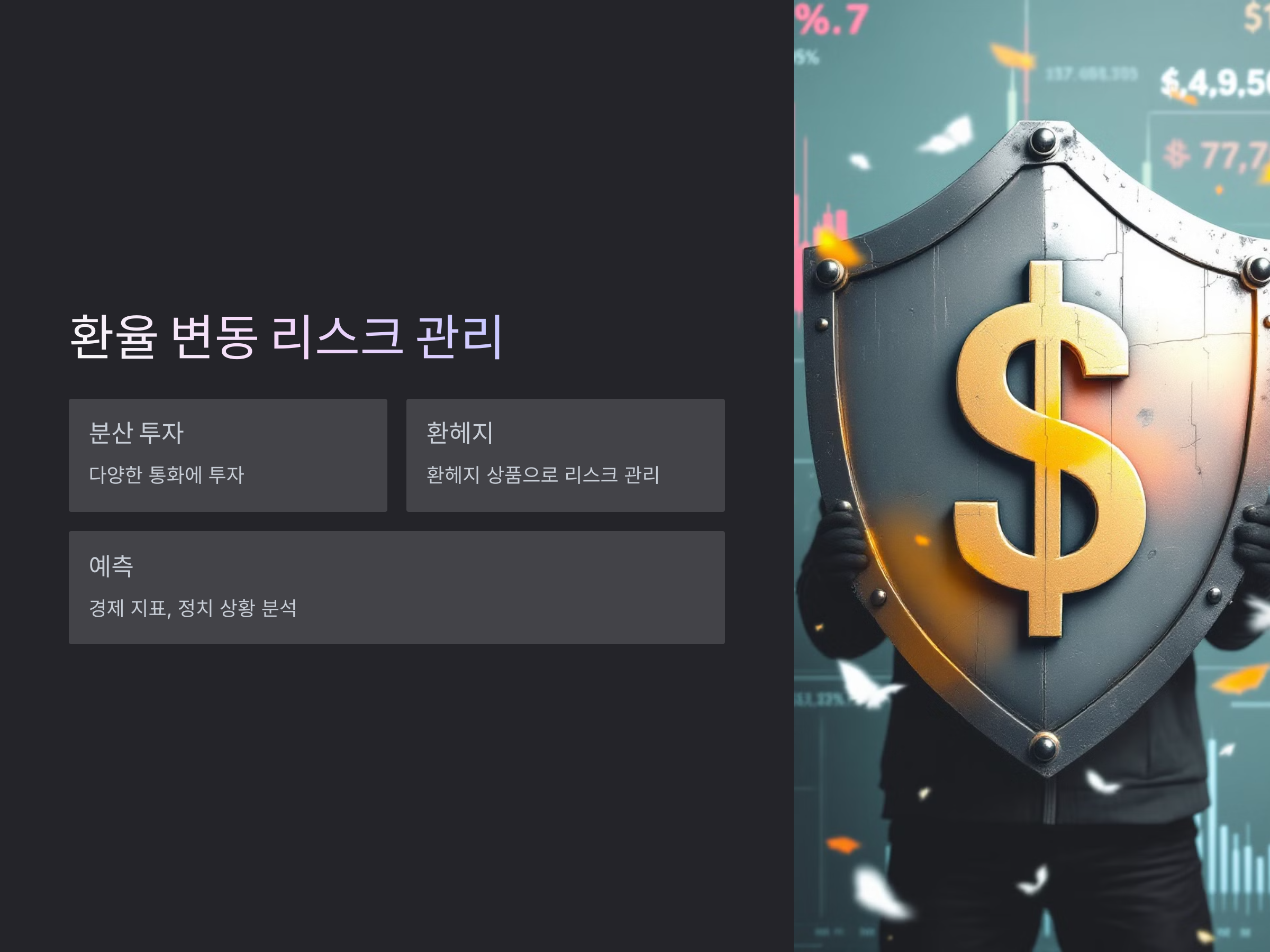 환율 변동은 그만큼 리스크가 따릅니다. 변동성이 큰 환율 시장에서 투자를 하거나 환전을 하는 것은 항상 리스크를 동반합니다. 따라서 이를 효과적으로 관리하는 방법을 알아두는 것이 중요합니다.