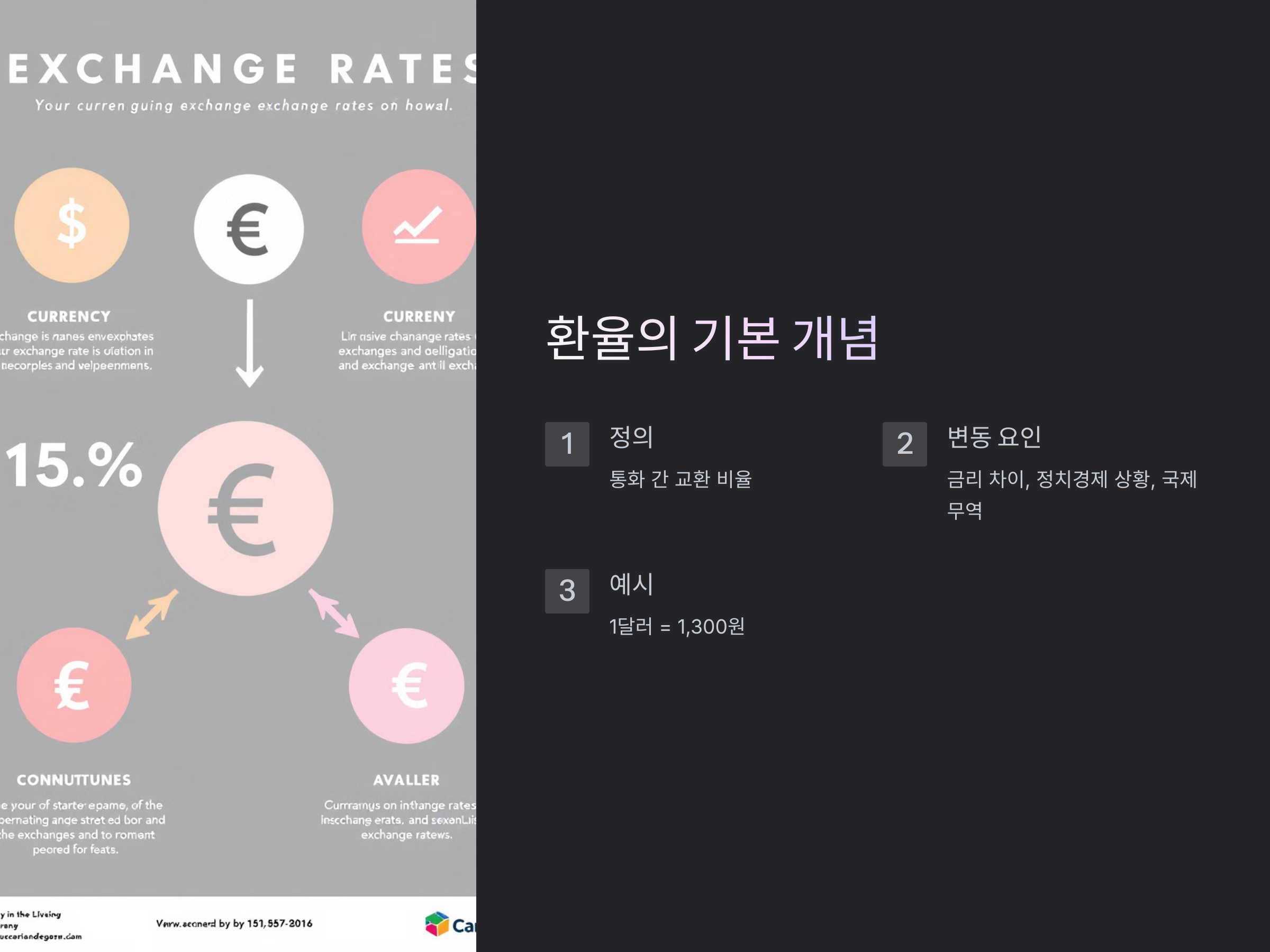 환율은 한 나라의 통화가 다른 나라의 통화와 교환되는 비율을 말합니다. 예를 들어, 1달러가 1,300원이라면, 1달러를 교환하는 데 1,300원이 필요하다는 뜻입니다. 이 환율은 여러 가지 요소에 따라 변동하는데, 주요 원인은 다음과 같습니다.
