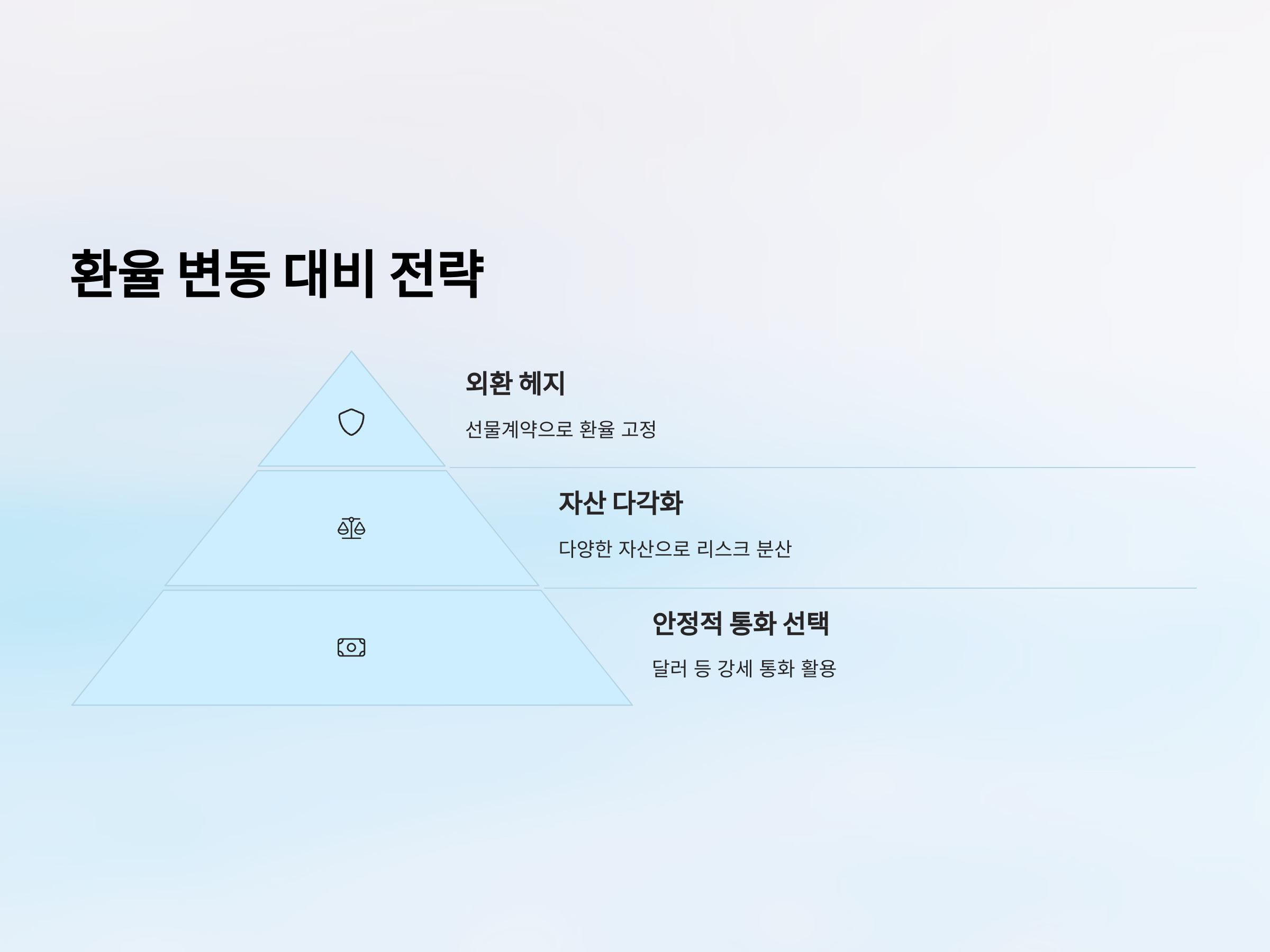 환율 변동에 대비하기 위한 전략은 여러 가지가 있습니다. 기업과 개인 모두에게 적용 가능한 전략을 아래와 같이 정리할 수 있습니다.