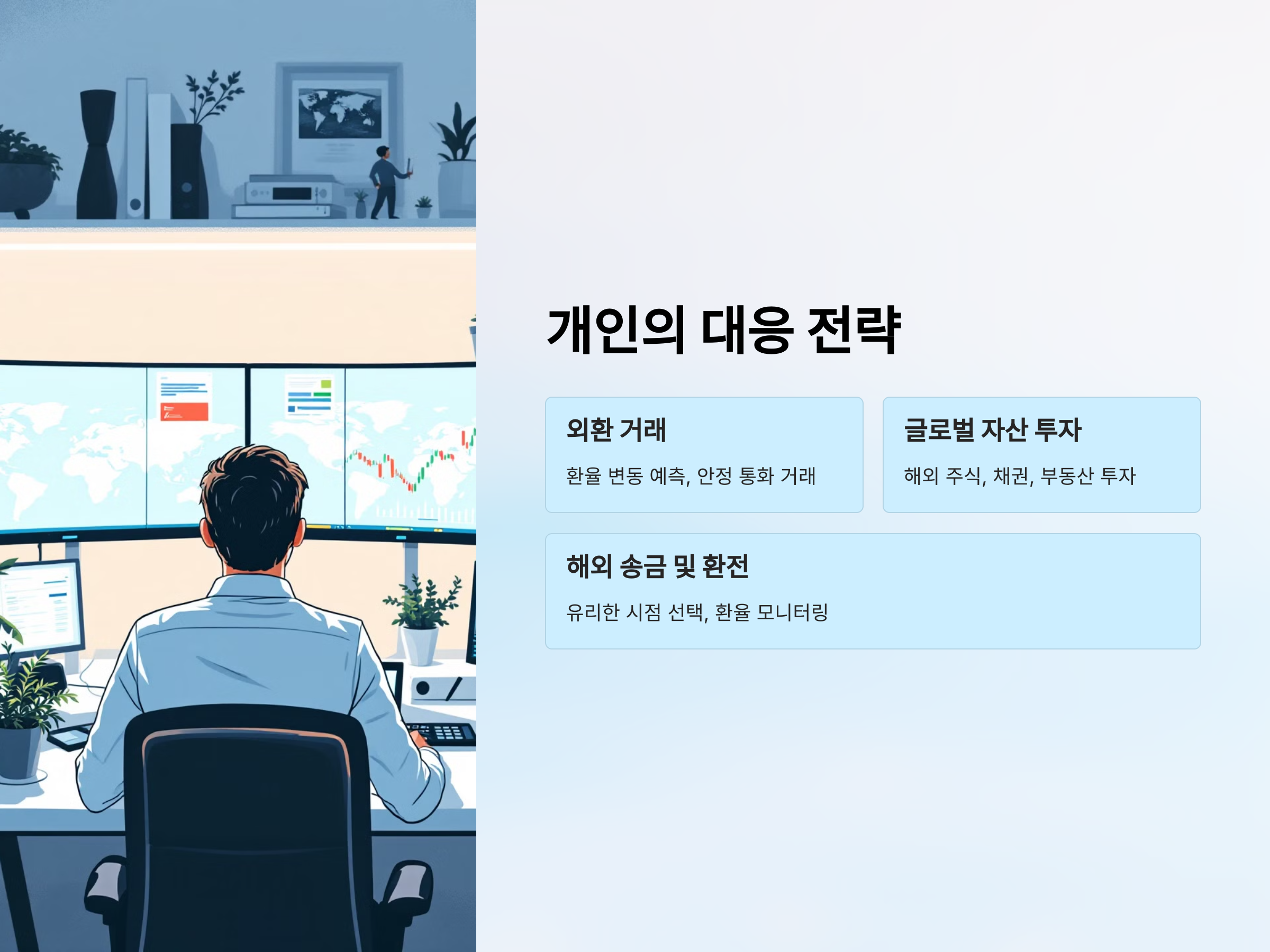 개인은 환율 변동에 대응하기 위해 글로벌 자산에 투자할 수 있습니다. 해외 주식, 채권, 부동산 등 다양한 자산에 투자함으로써, 환율 변동에 의한 리스크를 분산할 수 있습니다. 특히, 글로벌 경제와 관련된 자산에 투자하면 경제 위기 시에도 상대적으로 안정적인 수익을 얻을 수 있습니다.