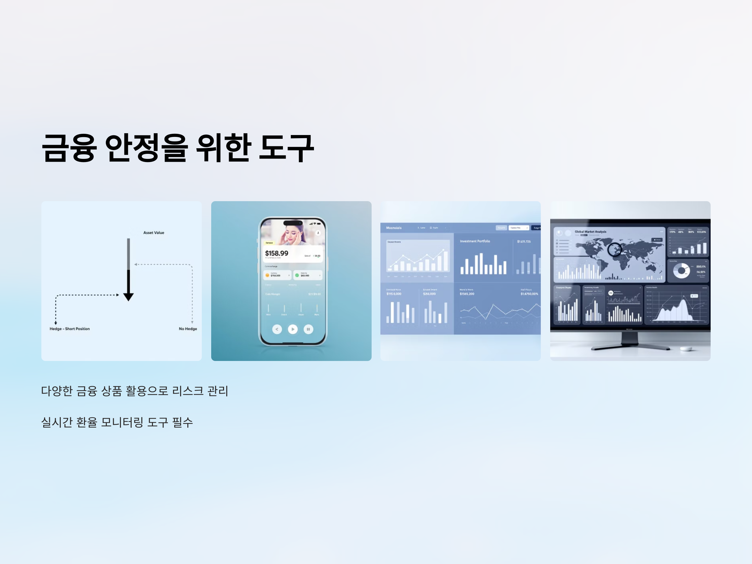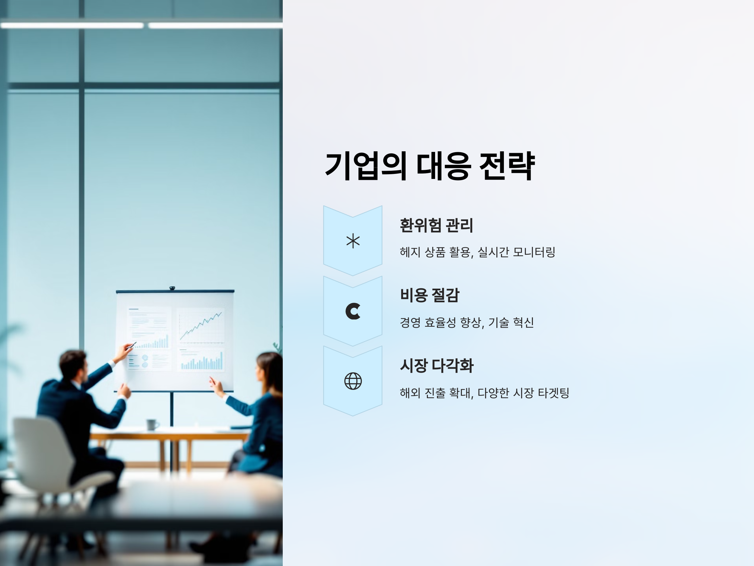 기업들이 환율 변동에 효과적으로 대응하기 위해서는 환위험 관리 전략을 수립해야 합니다. 기업은 외환 거래에서 발생할 수 있는 손실을 최소화하기 위해 헤지(hedge) 전략을 사용합니다. 헤지 전략에는 외환 선물 계약, 옵션, 통화 스왑 등의 금융 상품이 포함됩니다. 이러한 전략을 통해 환율 변동으로 인한 리스크를 줄이고, 예측할 수 없는 경제 상황에도 안정적인 경영을 할 수 있습니다.