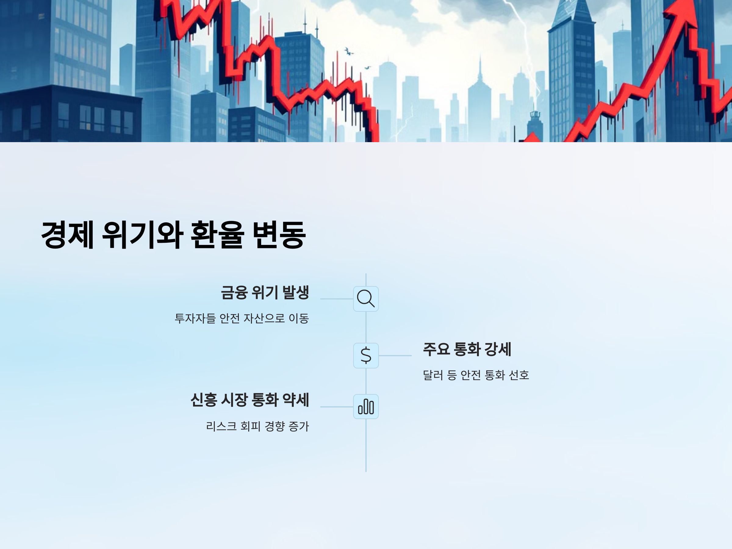 경제 위기 시 환율은 급격히 변동할 수 있습니다. 예를 들어, 금융 위기나 지정학적 리스크가 발생하면, 투자자들은 안전 자산으로 자금을 이동시키기 때문에 환율이 크게 영향을 받을 수 있습니다. 이러한 위기 상황에서 안전 자산으로 선호되는 통화는 달러와 같은 주요 통화이며, 이는 해당 통화의 강세를 부추깁니다.