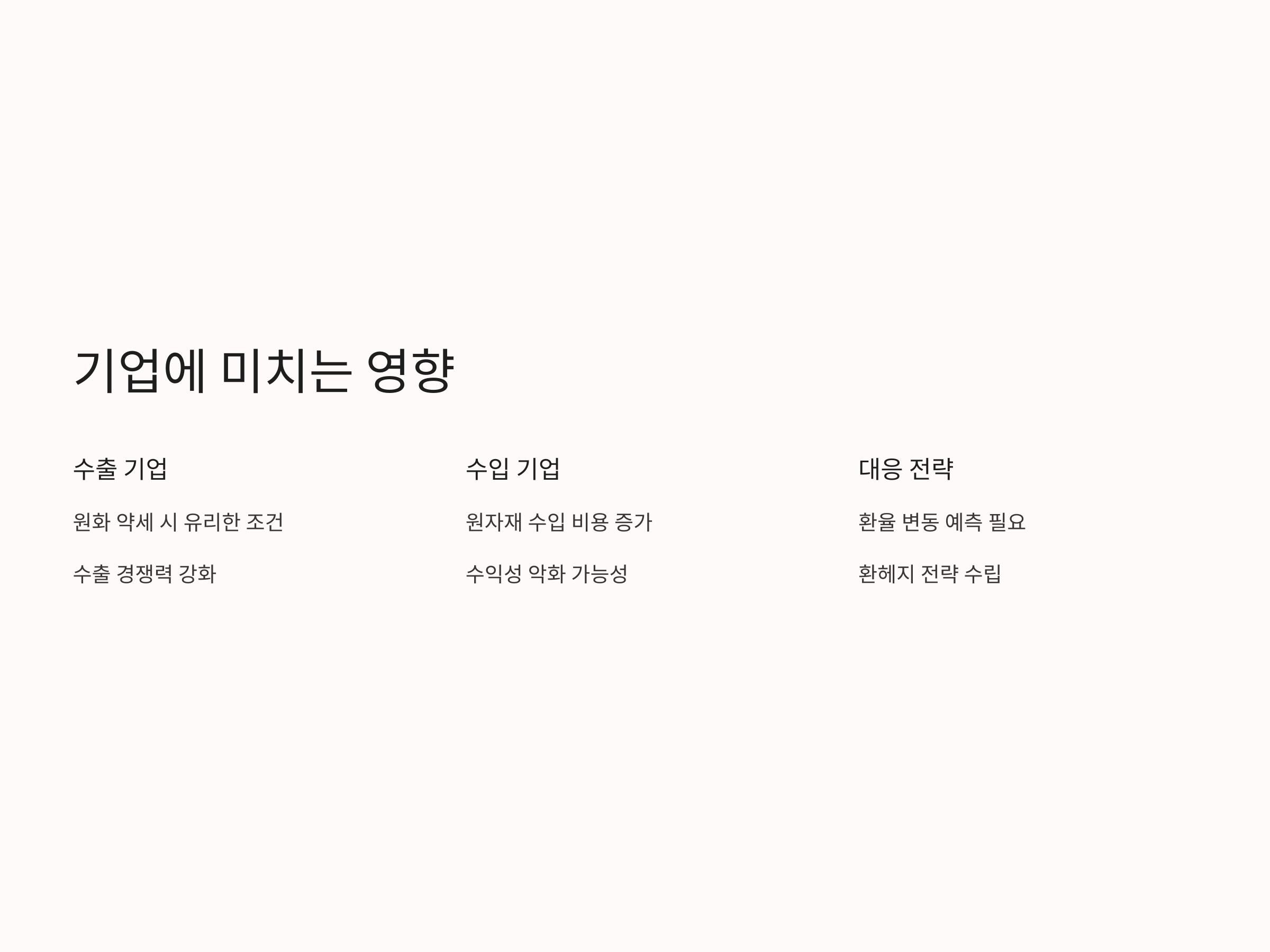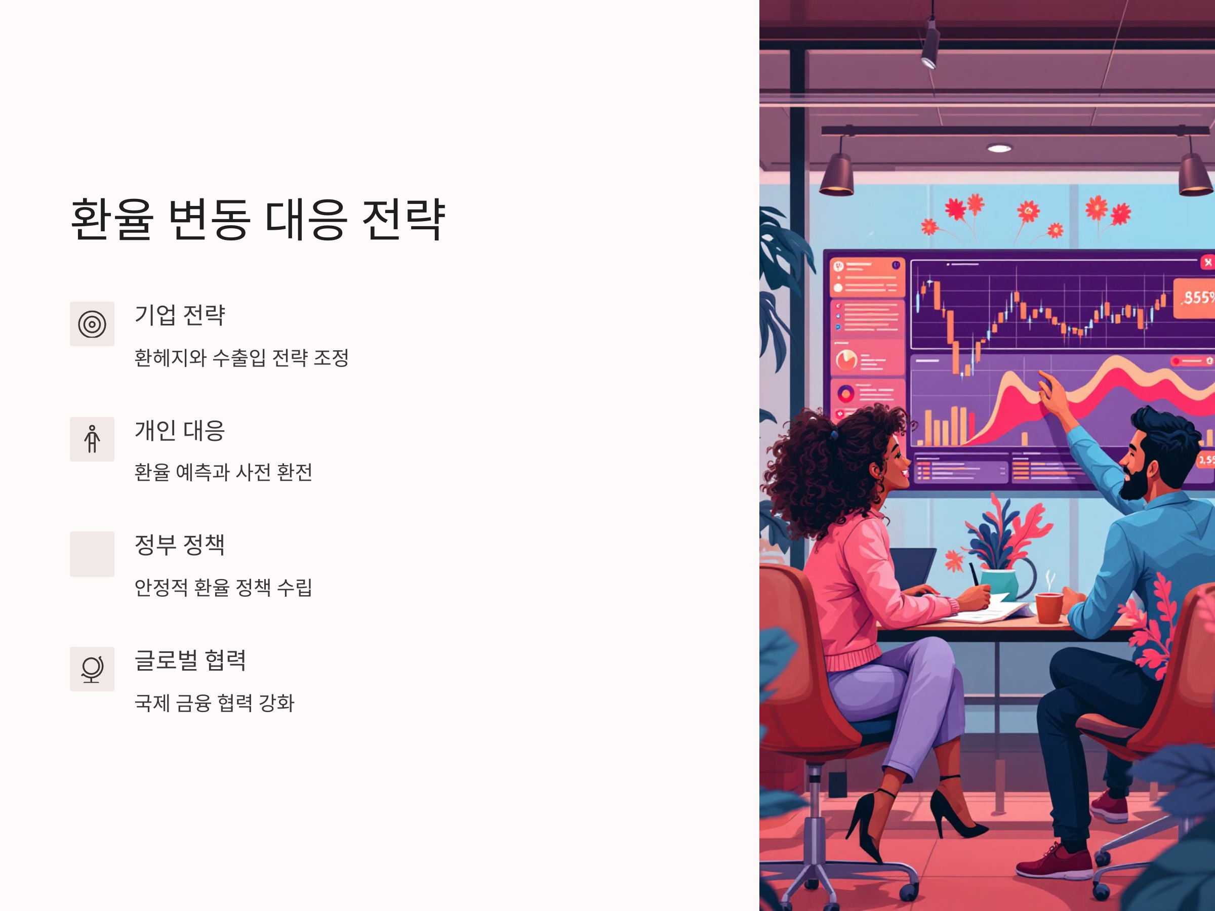 환율 변동은 수출입 기업에 큰 영향을 미칩니다. 예를 들어, 원화가 약세일 경우, 한국의 수출기업은 유리한 조건을 갖추지만, 원자재를 수입하는 기업들은 비용이 증가할 수 있습니다. 기업들은 이를 고려해 환율 변동에 대응하는 전략을 세워야 합니다.