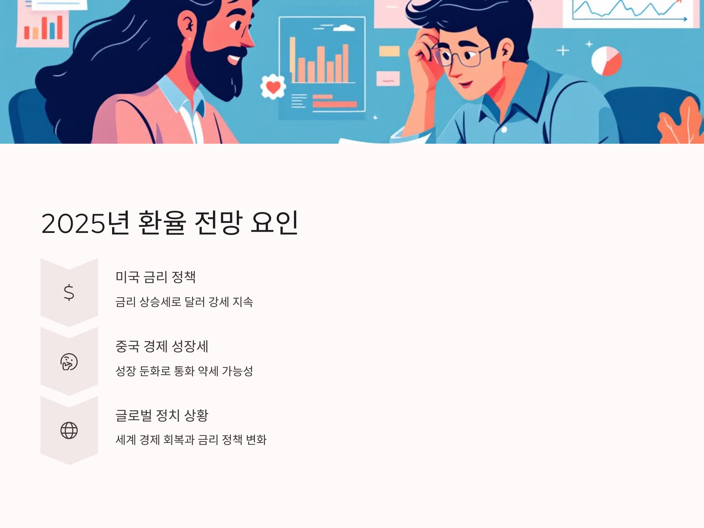 2025년 환율 변동의 주요 원인으로는 미국의 금리 정책, 중국 경제의 성장세, 그리고 글로벌 정치 상황을 들 수 있습니다. 2024년 말부터 미국의 금리가 상승세를 보였고, 이는 달러 강세를 이끌었습니다. 특히 미국 연방준비제도(Fed)의 금리 인상이 지속될 경우, 달러는 여전히 강세를 보일 가능성이 큽니다.