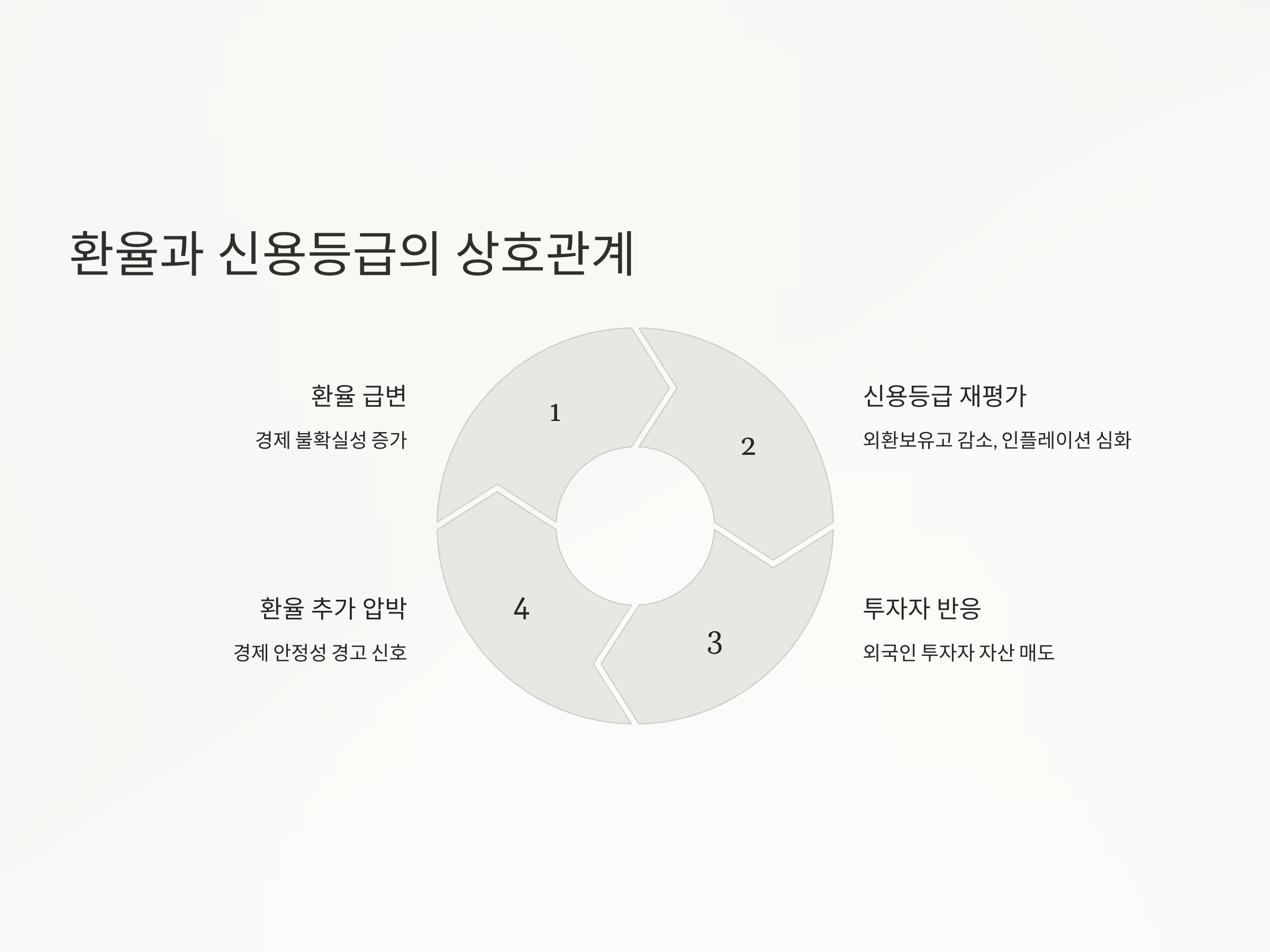 환율 변동과 국가 신용등급은 서로 밀접한 관계를 가집니다. 일반적으로 환율이 급격히 변동하면 국가 경제의 불확실성이 커지기 때문에, 신용평가기관들은 해당 국가의 신용등급을 재평가할 가능성이 있습니다. 예를 들어, 환율이 급격히 하락하거나 상승하면서 국가의 외환 보유고가 감소하거나 인플레이션이 심화될 경우, 신용등급이 하락할 수 있습니다.