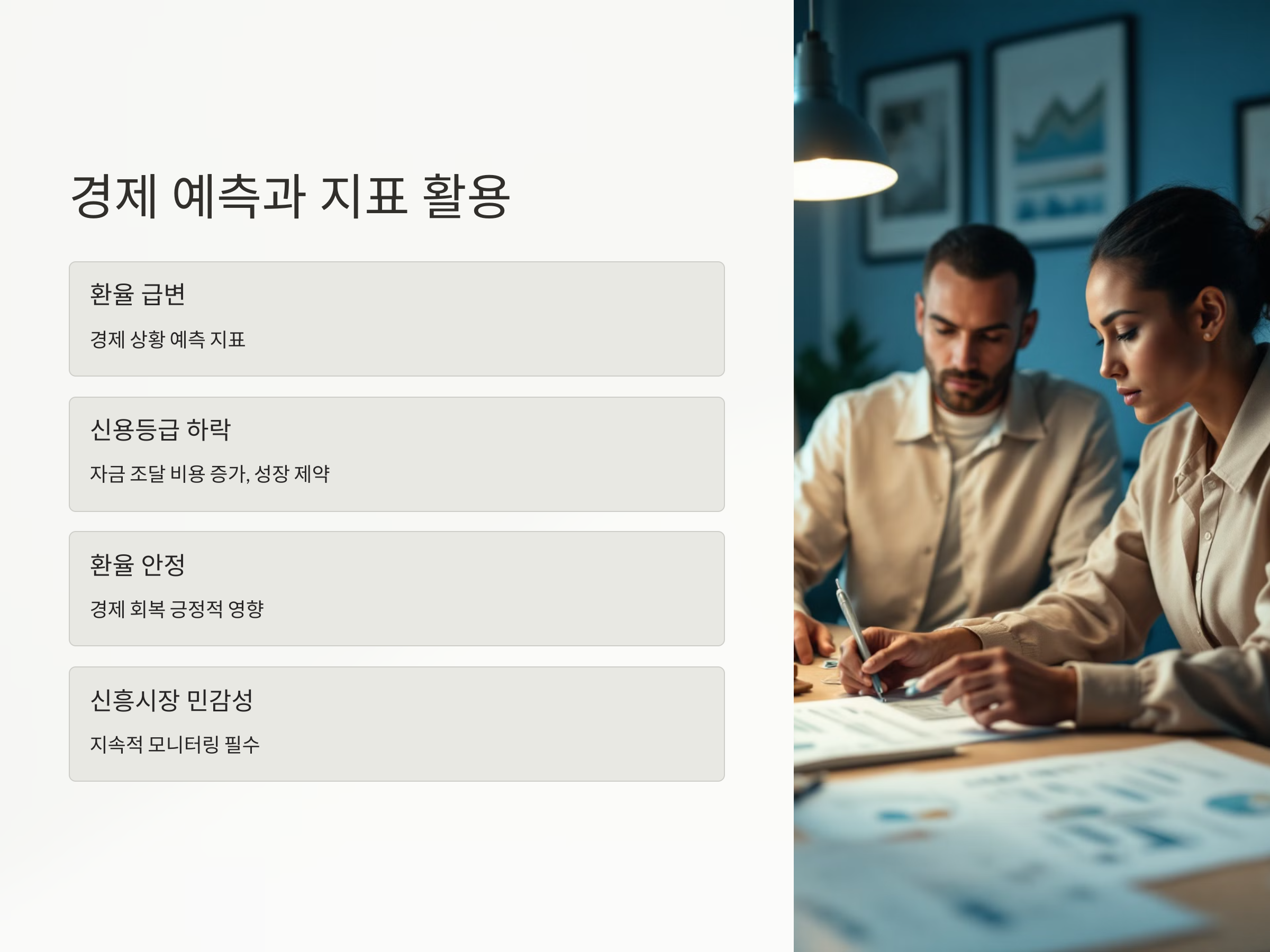 환율 변동과 신용등급의 변화는 경제 전문가들이 중요한 경제 지표로 활용하는 요소입니다. 환율이 급변하거나 국가 신용등급에 큰 변동이 있을 경우, 경제 전문가들은 이를 기반으로 향후 경제 상황을 예측할 수 있습니다. 예를 들어, 신용등급이 하락하면 자금 조달 비용이 증가하고, 국가의 경제 성장에 제약을 가할 수 있습니다. 반면, 환율이 안정적이면 경제 회복에 긍정적인 영향을 미칠 수 있습니다.