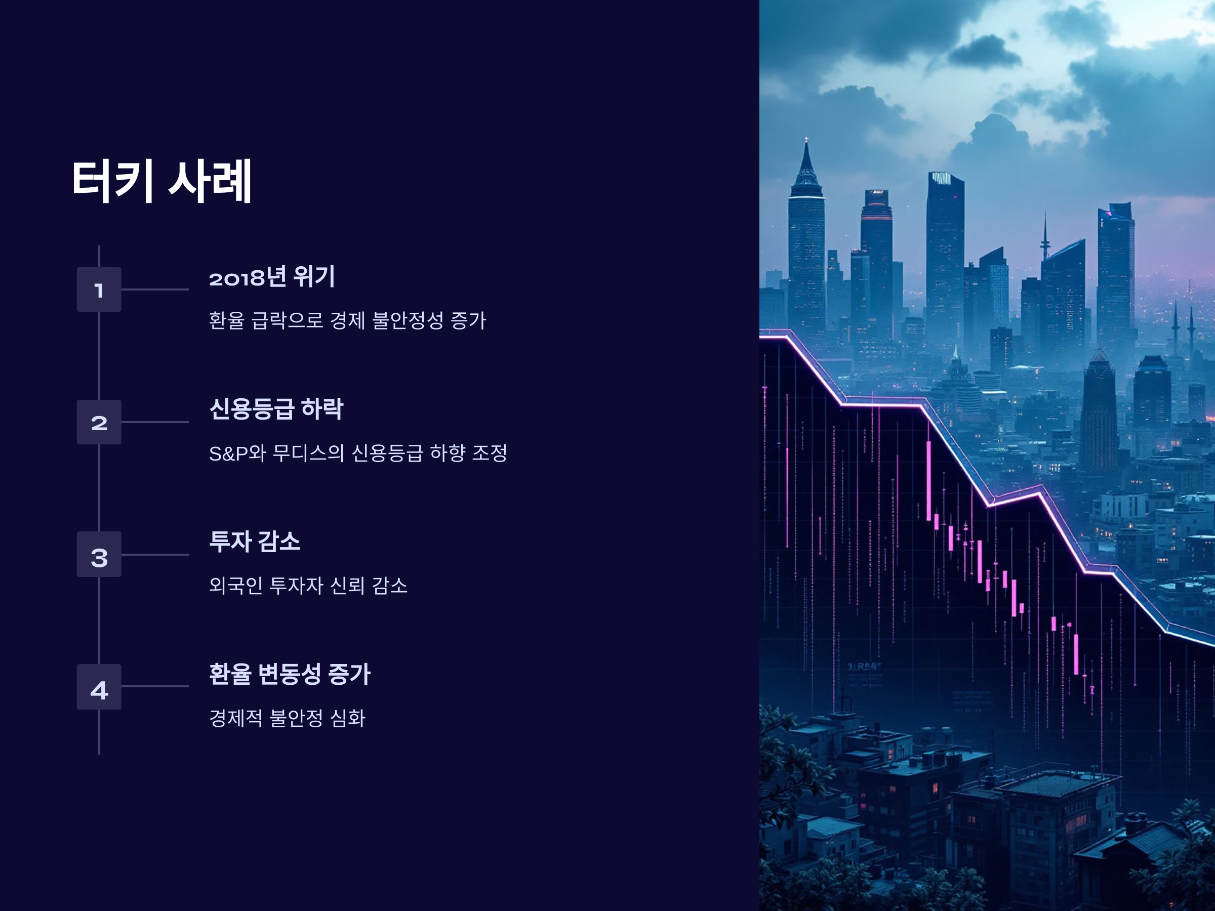 최근 몇 년간 터키와 아르헨티나는 환율 변동과 신용등급 하락이 겹치면서 경제적 위기를 겪었습니다. 특히 터키는 2018년부터 환율이 급락하면서 경제 불안정성이 크게 증가했고, 이로 인해 S&P와 무디스는 터키의 신용등급을 하향 조정했습니다. 신용등급 하락은 외국인 투자자들에게 신뢰를 줄이고, 환율 변동성을 더욱 키우는 결과를 낳았습니다.