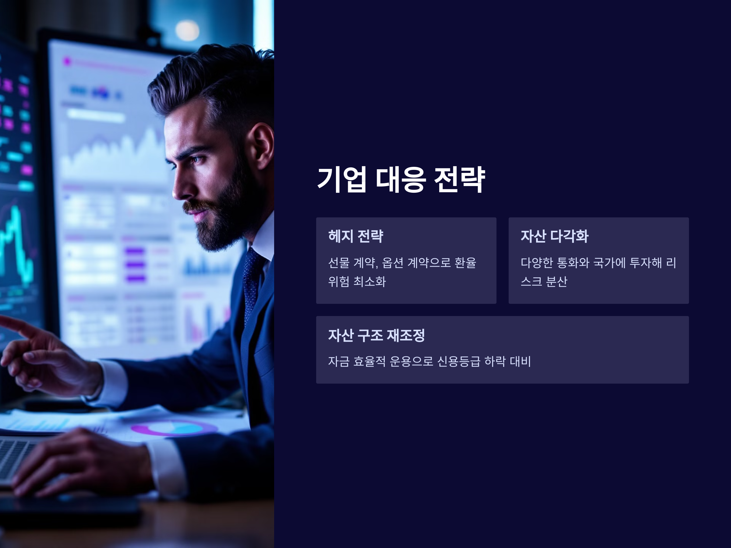 환율 변동과 신용등급 하락에 대응하기 위해 기업들은 다양한 전략을 취할 수 있습니다. 첫째, 헤지 전략을 통해 환율 변동의 위험을 줄일 수 있습니다. 예를 들어, 환율 변동성이 큰 국가에서 운영 중인 기업은 선물 계약이나 옵션 계약 등을 활용해 환율 위험을 최소화할 수 있습니다.