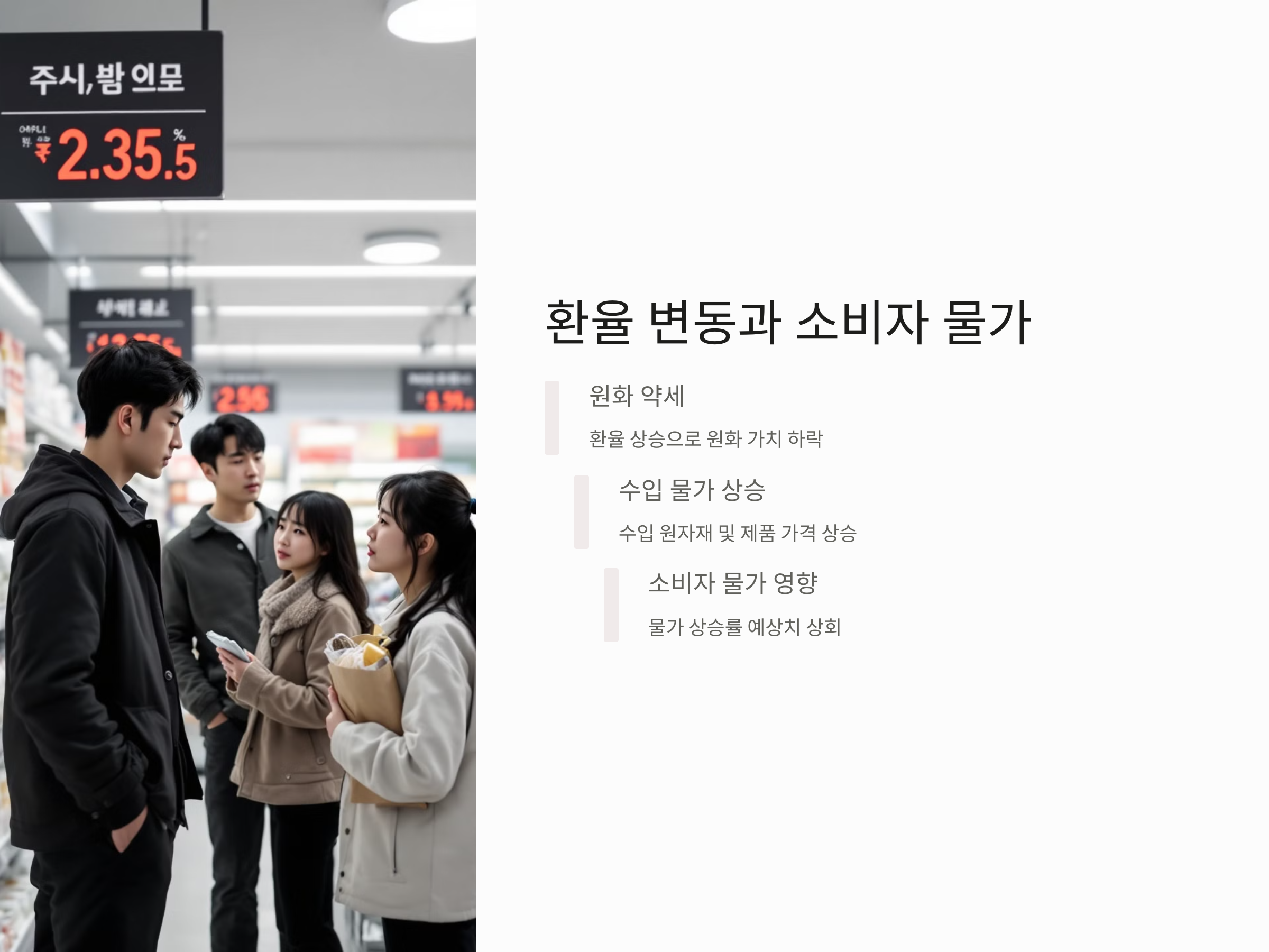 환율 변동은 소비자 물가에도 영향을 미칩니다. 원화 약세로 인해 수입 물가가 상승하면, 이는 소비자 물가 상승으로 이어질 수 있습니다. 실제로 최근 소비자 물가 상승률이 예상치를 상회하는 등 환율 변동의 영향이 나타나고 있습니다. citeturn0news24