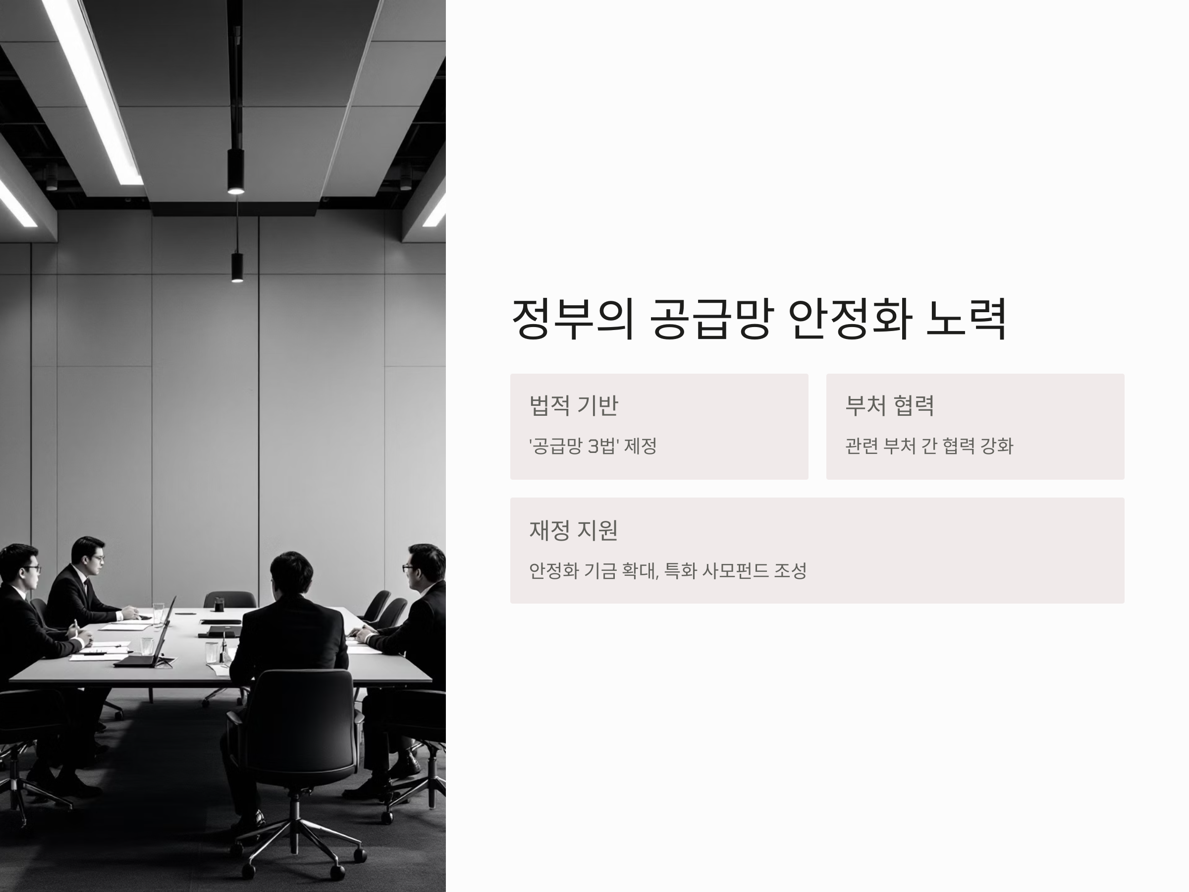 정부는 공급망 불확실성에 대응하기 위해 '공급망 3법'을 제정하고, 관련 부처 간 협력을 강화하고 있습니다. citeturn0search1 또한, 공급망 안정화 기금을 확대하고, 민간과 협력하여 공급망 특화 사모펀드를 조성하는 등 다양한 지원책을 마련하고 있습니다. citeturn0search9
