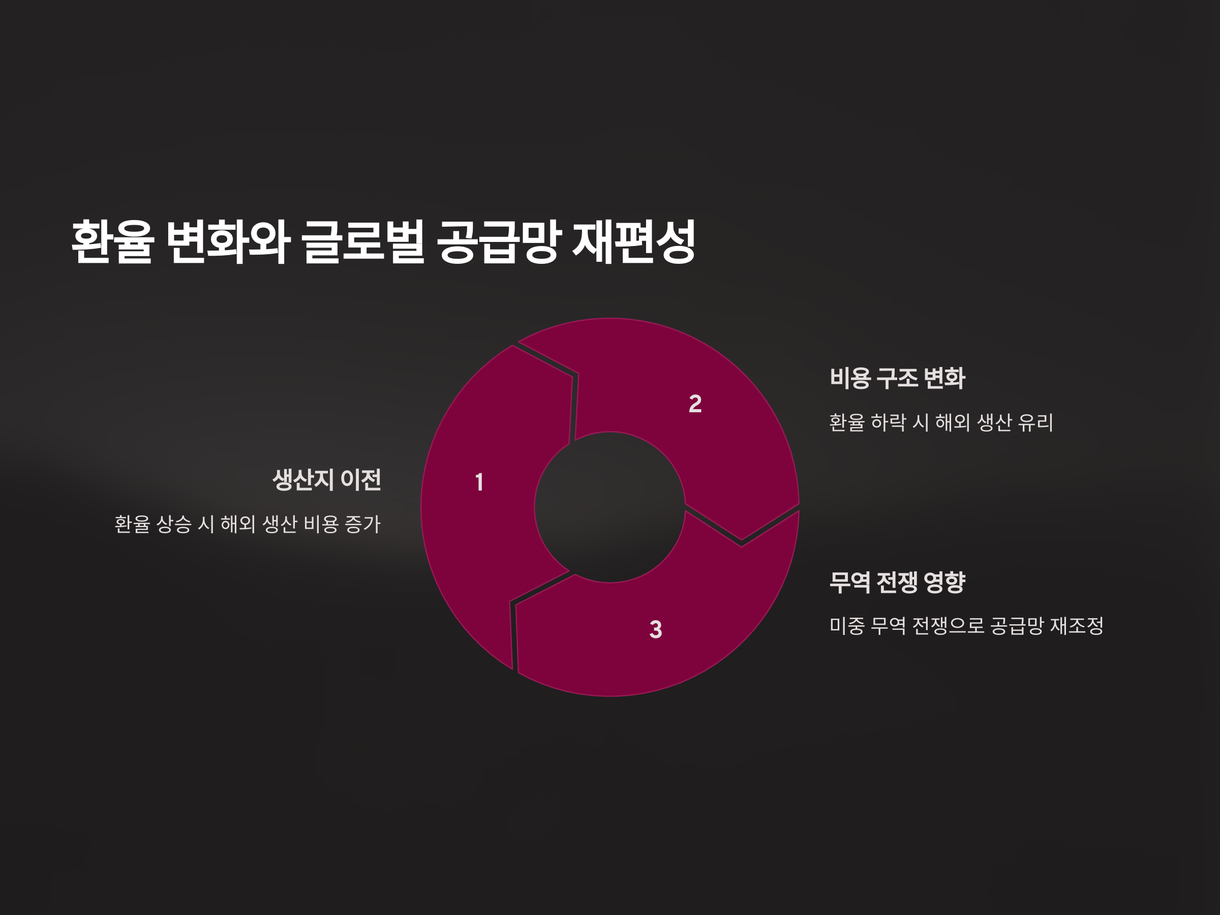 환율 변동은 글로벌 공급망의 비용 구조를 변화시킬 수 있습니다. 예를 들어, 환율 상승 시 수입 비용이 증가하고, 이는 기업의 생산비용 상승으로 이어질 수 있습니다.
