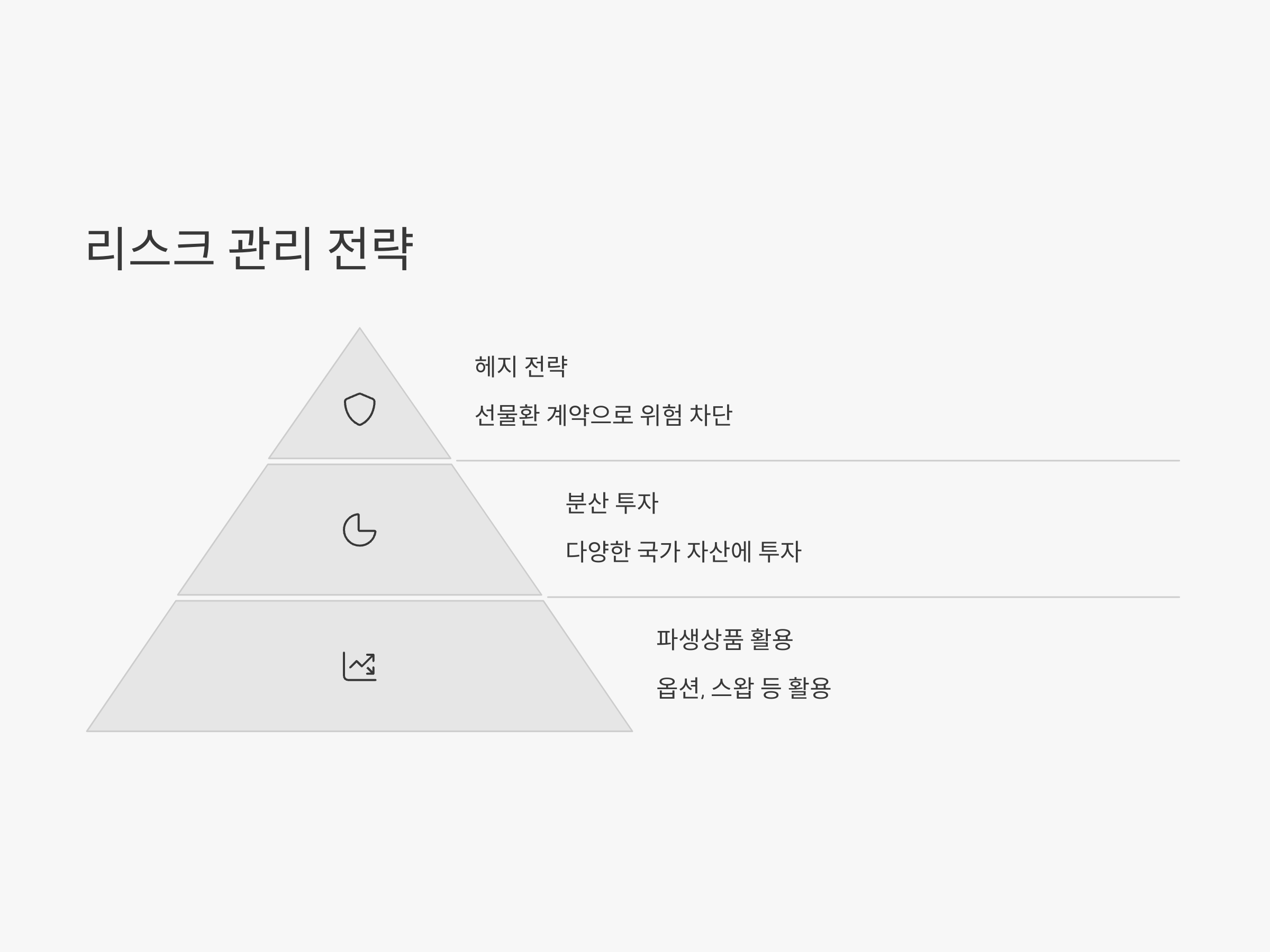 환율 변동성을 관리하는 것은 기업과 투자자에게 중요한 과제입니다. 이를 위해서는 몇 가지 리스크 관리 전략을 사용할 수 있습니다. 첫 번째로는 헤지 전략을 들 수 있습니다. 헤지는 환율 변동으로 인한 손실을 미리 차단하는 방법으로, 이를 통해 기업은 환율의 급격한 변동성으로부터 보호받을 수 있습니다. 두 번째로는 분산 투자 전략이 있습니다. 여러 국가의 자산에 투자함으로써 특정 국가의 환율 변동성에 대한 리스크를 줄일 수 있습니다.