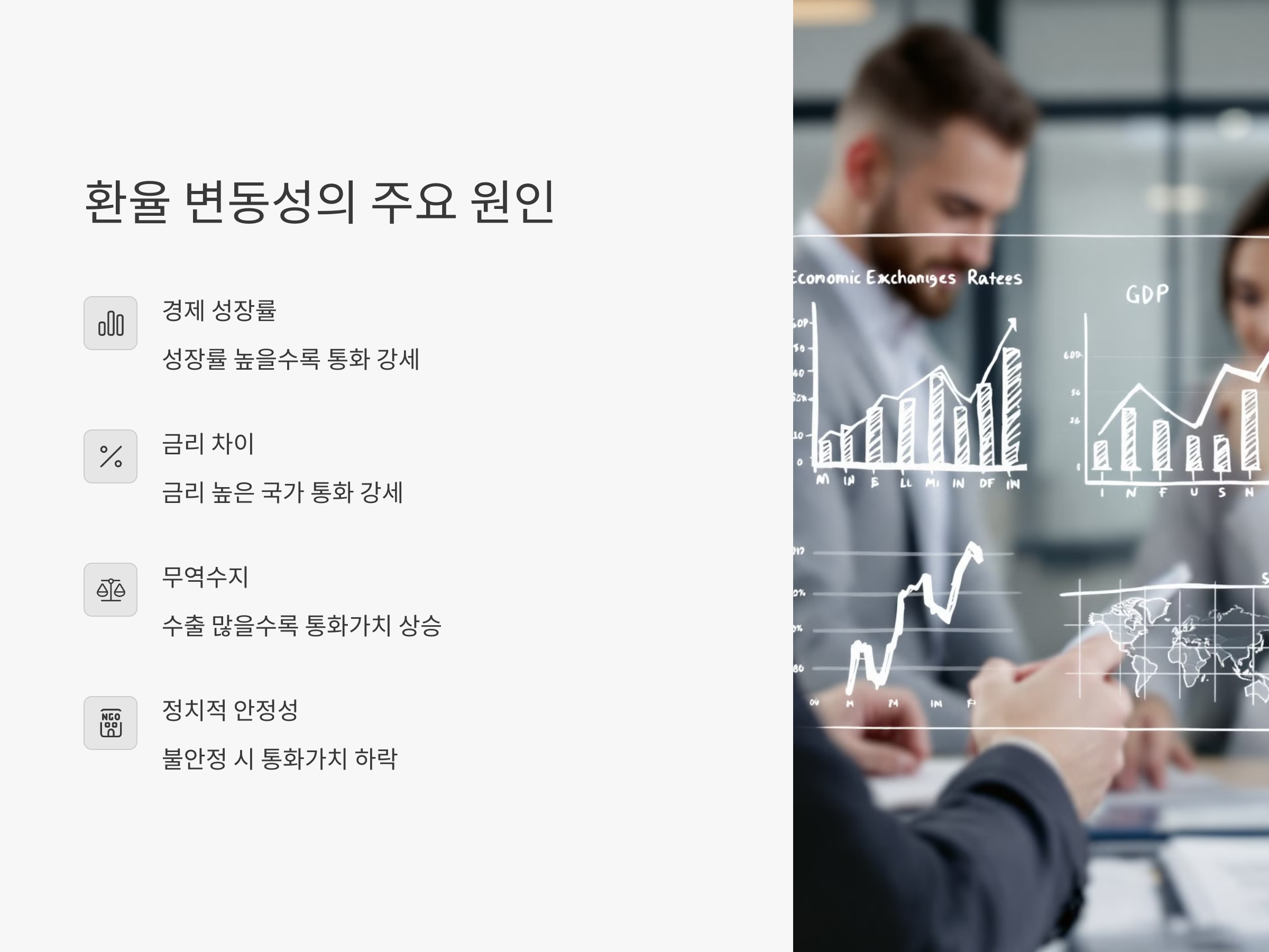 환율은 다양한 경제적, 정치적 요인에 의해 변동합니다. 주요 원인으로는 국가의 경제 성장률, 금리 차이, 무역수지, 정치적 안정성 등이 있습니다. 예를 들어, 한 나라의 금리가 다른 나라보다 높다면, 외환 시장에서 해당 국가의 통화는 상대적으로 강세를 보일 가능성이 큽니다. 또한, 국가의 경제 성장률이 높을수록 해당 통화는 더 강하게 움직일 수 있습니다. 반면, 정치적 불안정성이나 외교적 갈등은 환율에 부정적인 영향을 미칠 수 있습니다.